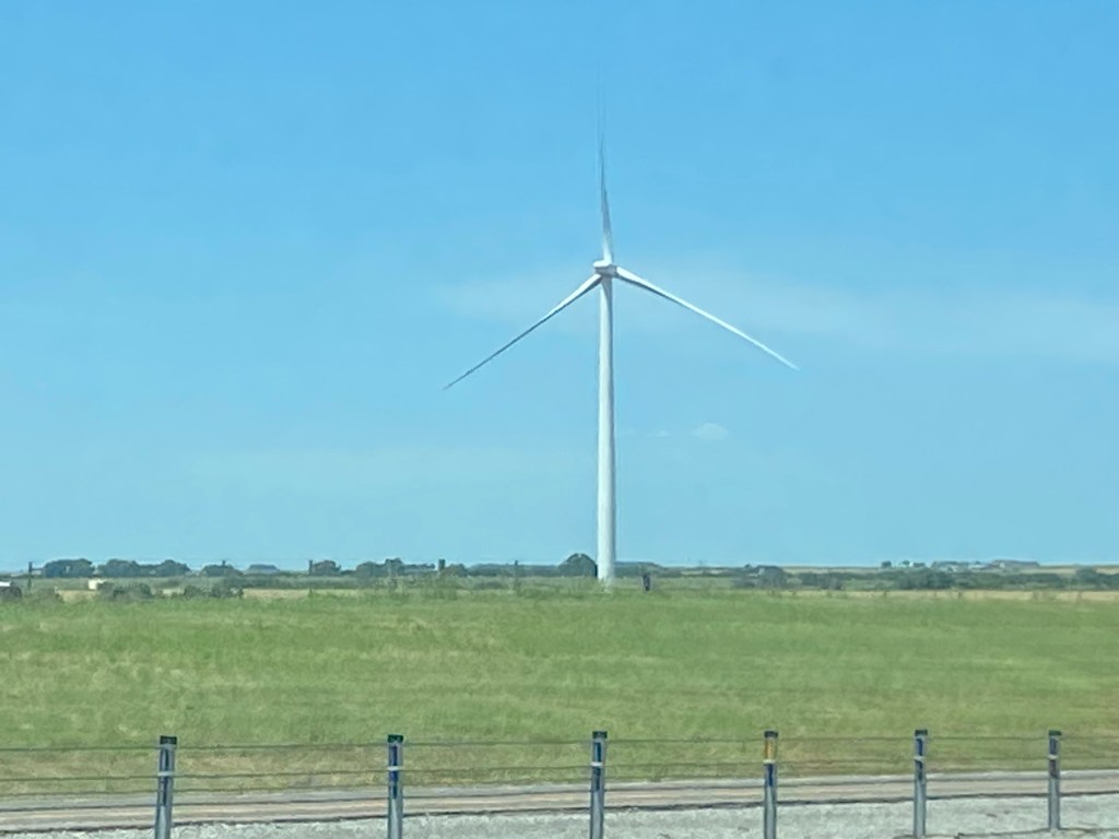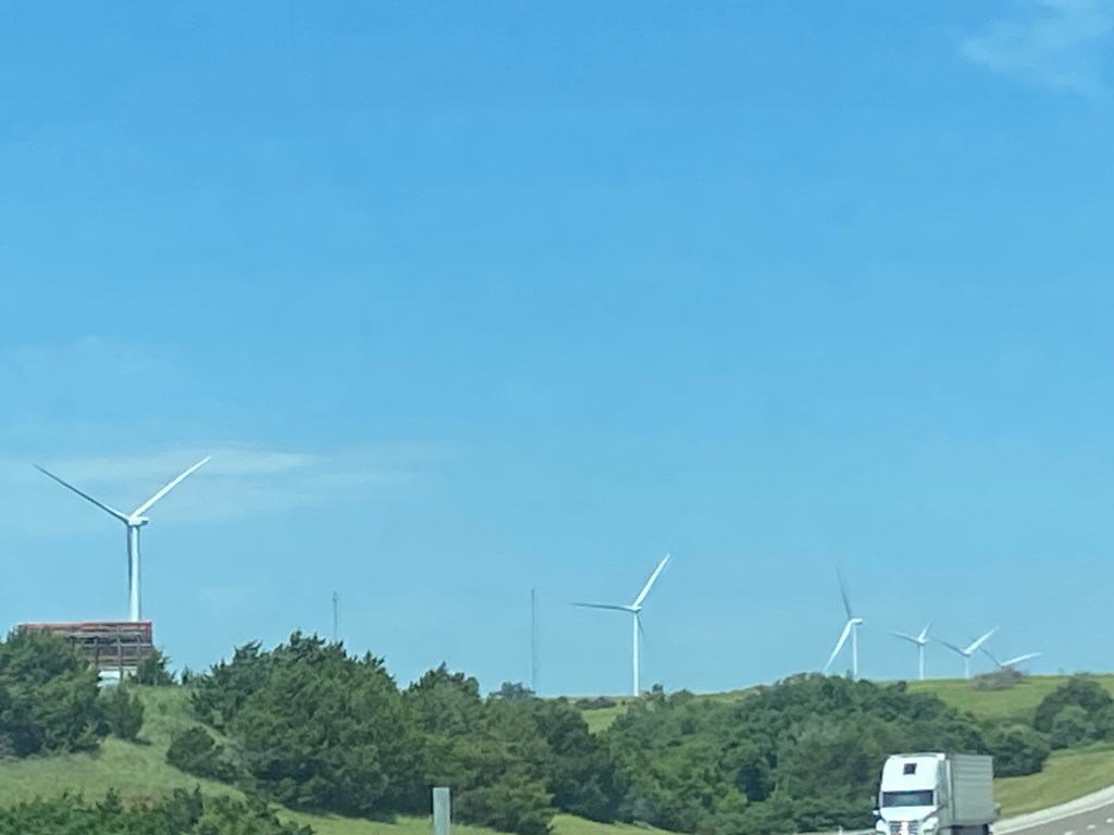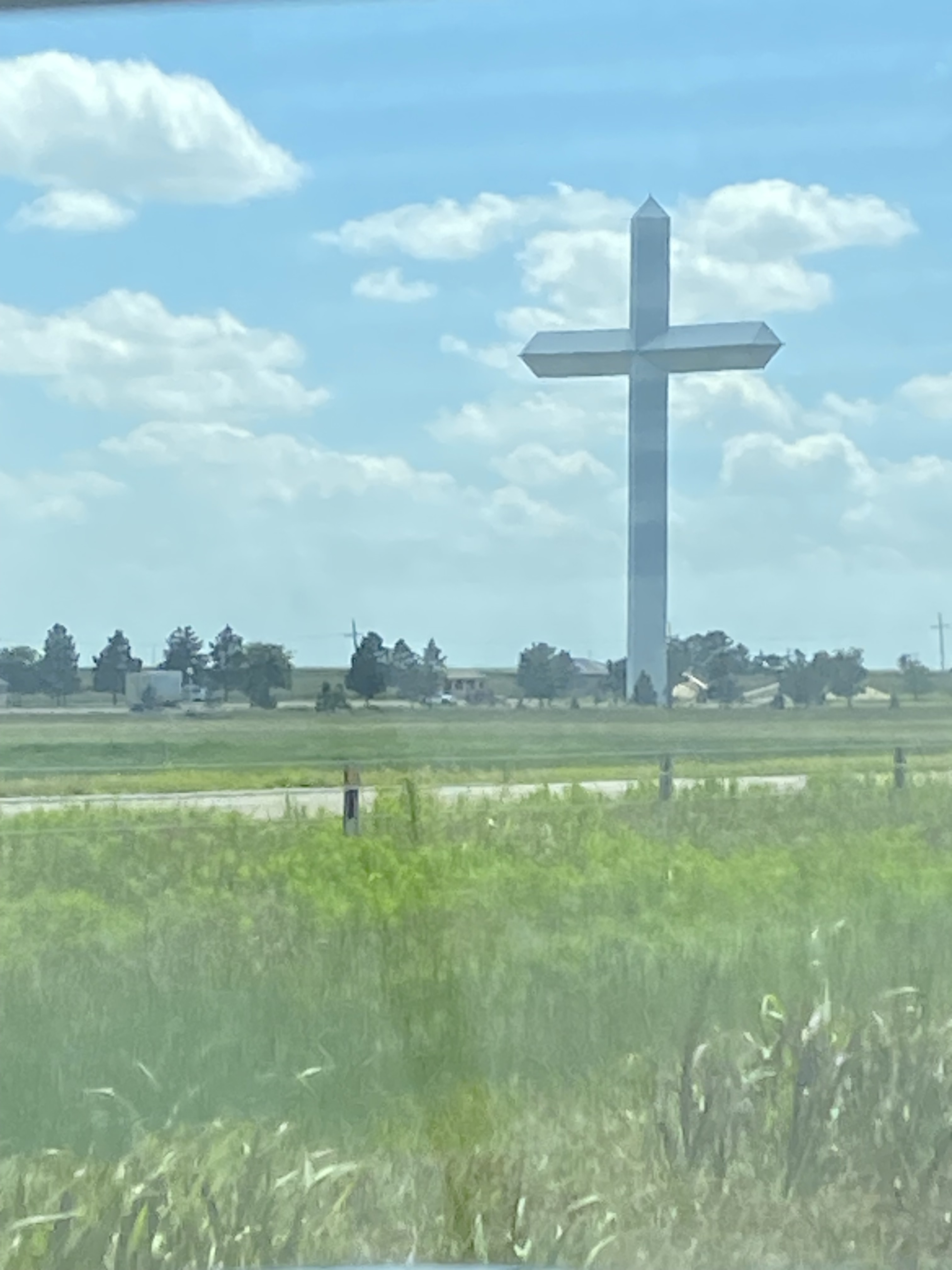 As we continued through OK, the sun came out and the clouds became friendly. It was at that moment that we understood the OK car tag design. The blue tag perfectly matched the baby blue sky. The white abstract bird image on the tag matched the wispy white clouds spotting the sky here and there. Try as I might, I didn’t find a bird-shaped cloud in the sky. OK was a beautiful state, and I loved seeing thousands of windmills throughout the landscape. (I tried to get an “up close” picture, and the windmill seemed so close in life but looks comically far away in the picture.) We also saw the largest cross I’ve ever seen.