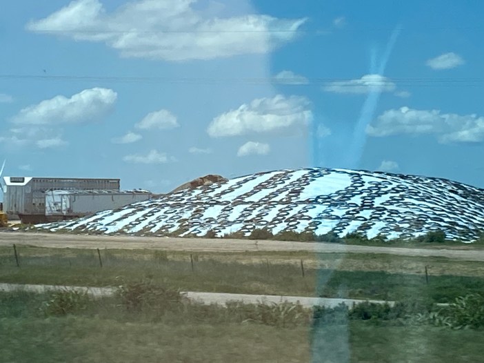 Back on the road, we quickly came upon Texas. In addition to windmills, we occasionally saw these weird tire mountains. It looked like someone had made huge strawberry plant mounds (with the white plastic covering) and then buried tires in them. Is this some sort of TX recycling??