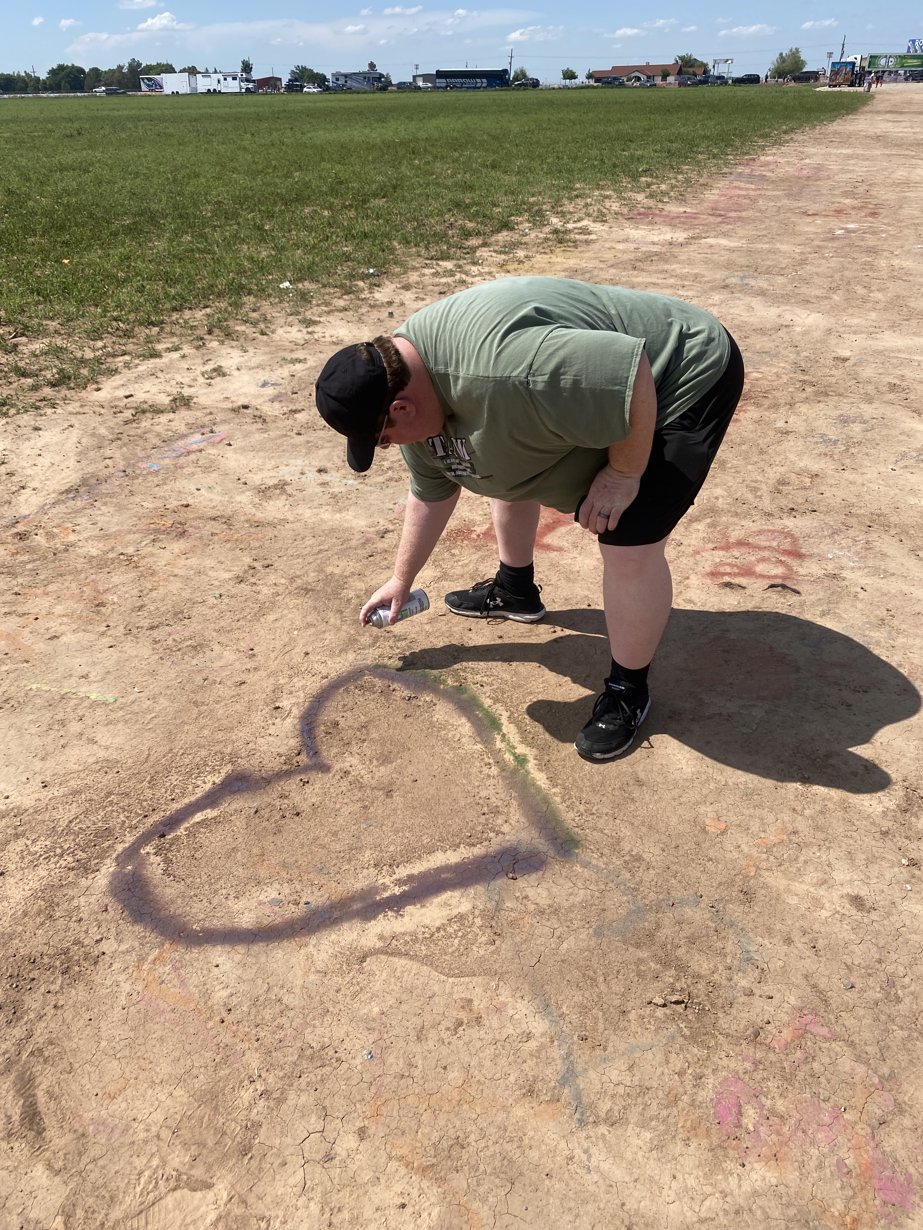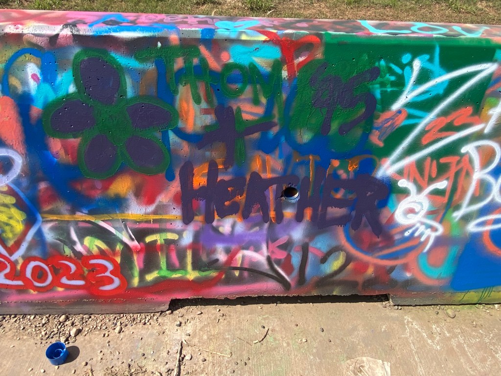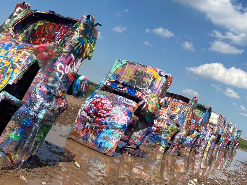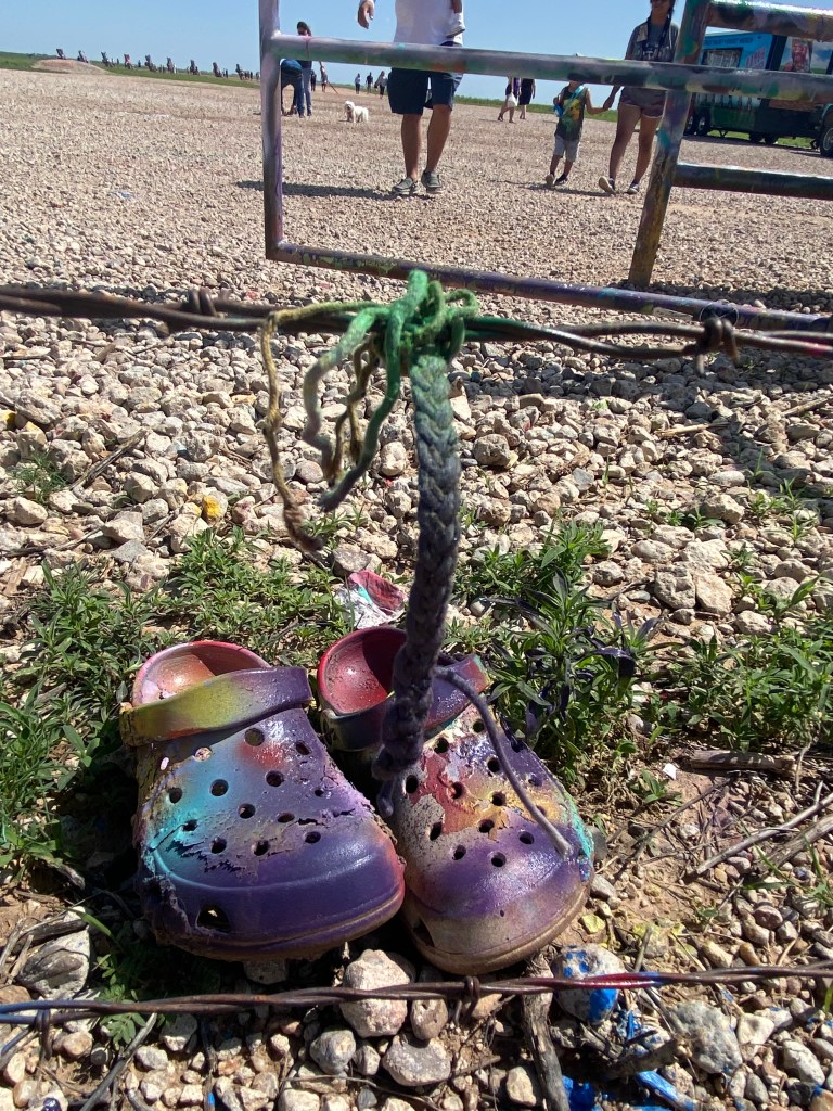 Our next stop was Cadillac Ranch. We came prepared with our spray paint but, sadly, flooding from this morning made it impossible to reach the cars without stepping into water and, most assuredly, deep Texas mud. It was still a cool site to see, and we painted on the ground and some walls to be part of things. I also had a bracelet to retire, as it was falling apart. It was a match to one Lizzy and I got together in summer 2019, so I couldn’t just throw it away. Instead, Thom and I painted it with our green and purple paint and tied it on the fence where people left all sorts of mementos. It seemed fitting to leave it near the colorfully painted Crocs. 🙂