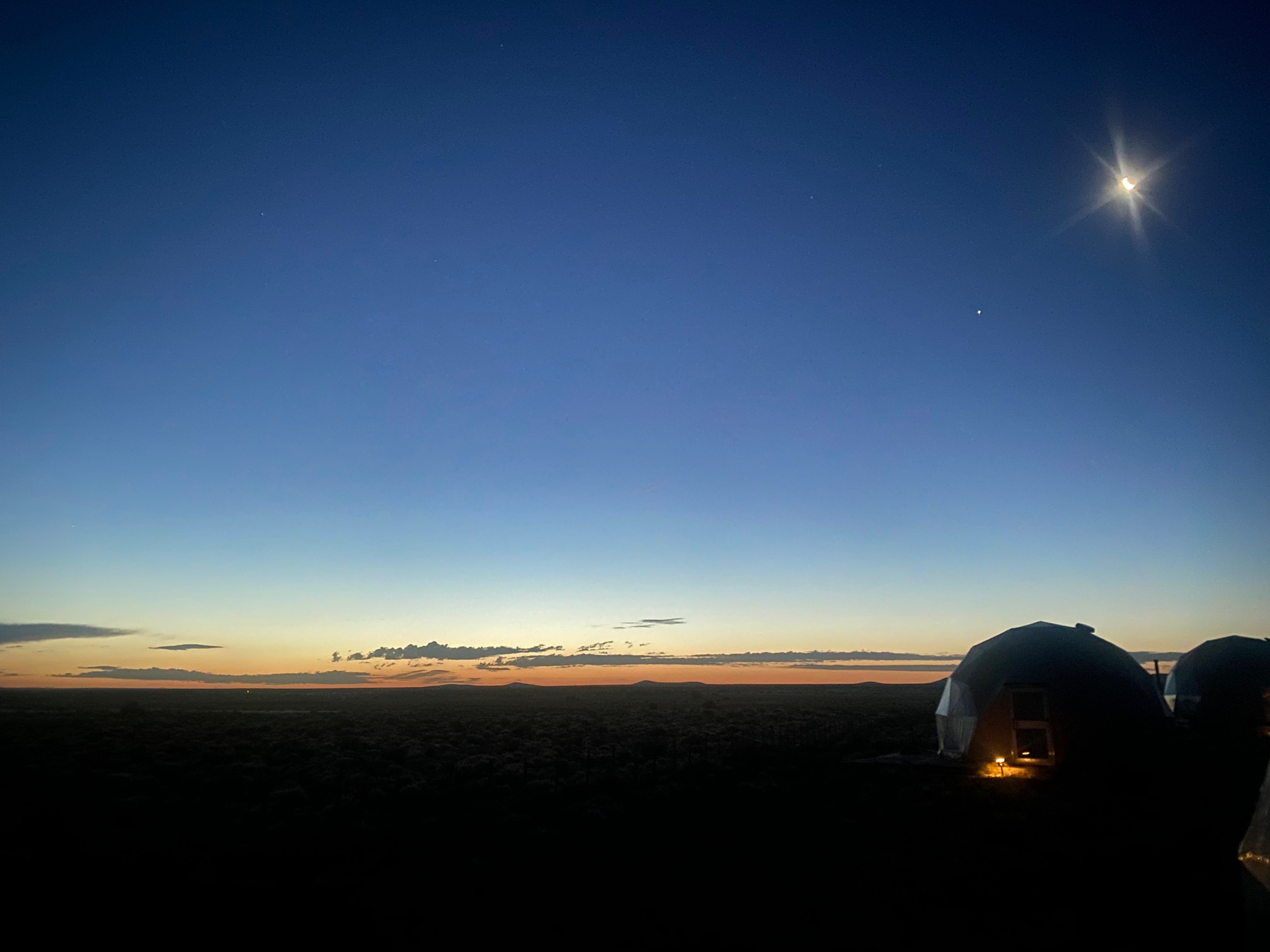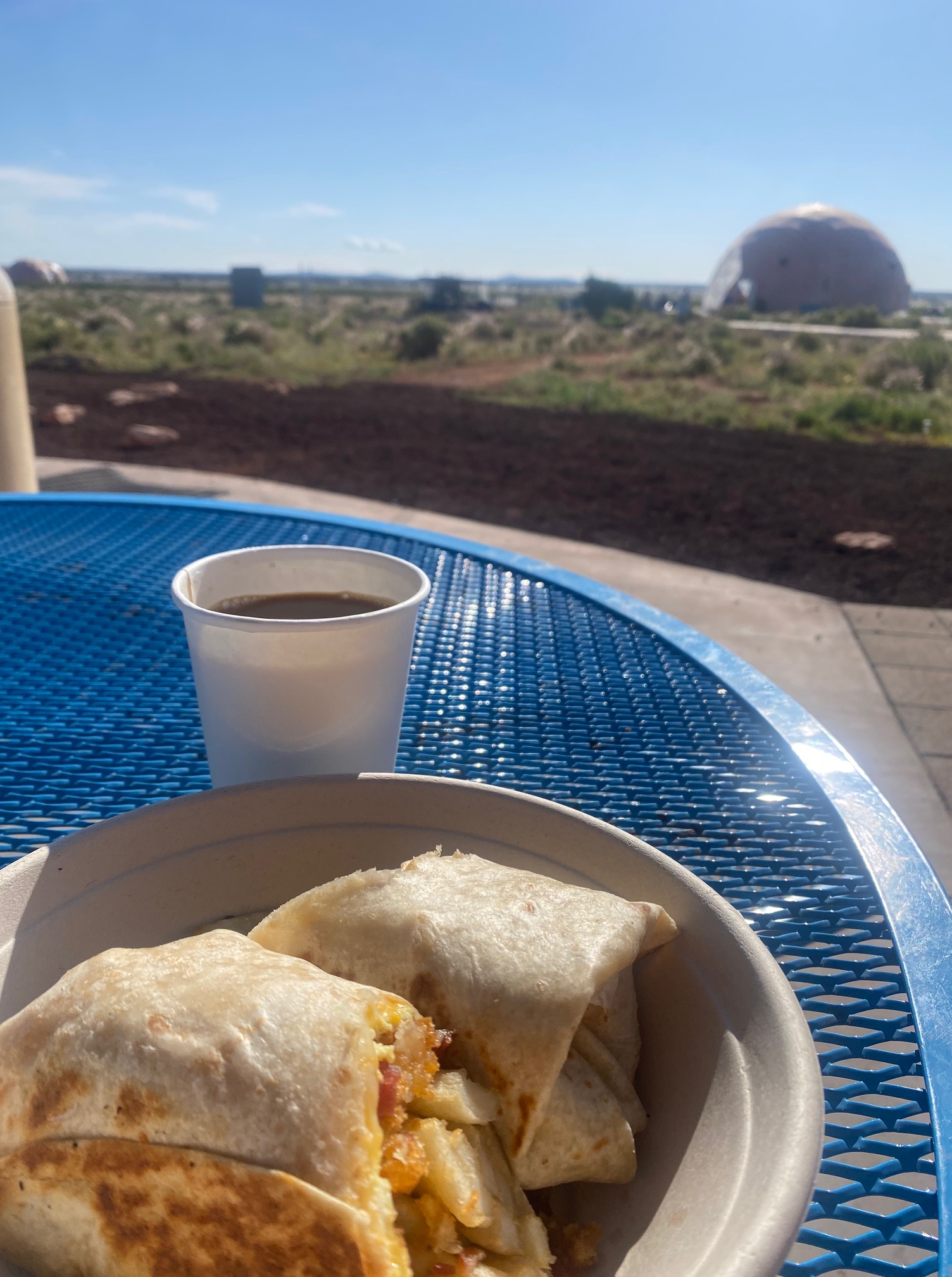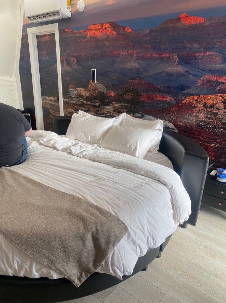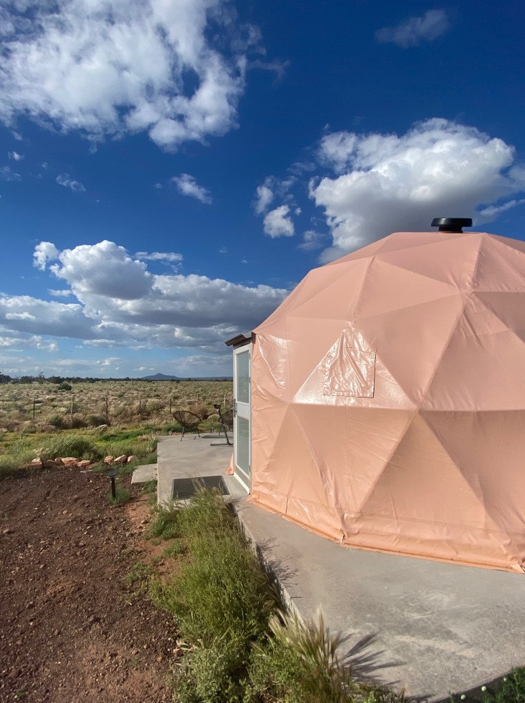 Last night, we stayed in one of the coolest glamping spots ever. We slept in a sky dome at the Clear Sky Resort. It was similar to a yurt except one side had a giant window looking into the desert and it had a clear window up top so you could see the stars. (It also had a bathroom–bonus points!) They had tons of activities (day and night) but we didn’t have time to take advantage of that. It would be an awesome place to take the family for a few days. We fell asleep in awe of the stars, and I got up for the desert sunrise. Y’all know I’m more of a sunset girl than a sunrise girl, but how often can you see a desert sunrise? Only problems: sunrise started at 4:15 and it was 38 degrees outside. I took a picture, grumbled about AZ not being on daylight savings time, and went back to sleep, LOL. When we finally did get up, we enjoyed a fantastic breakfast sitting in the desert.