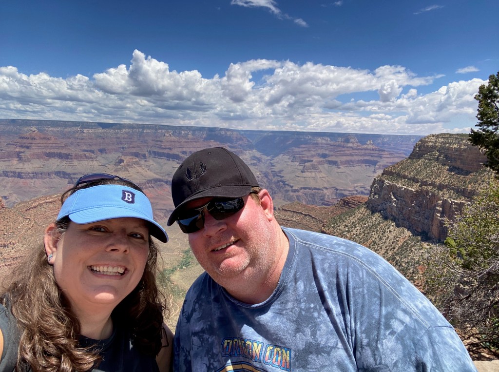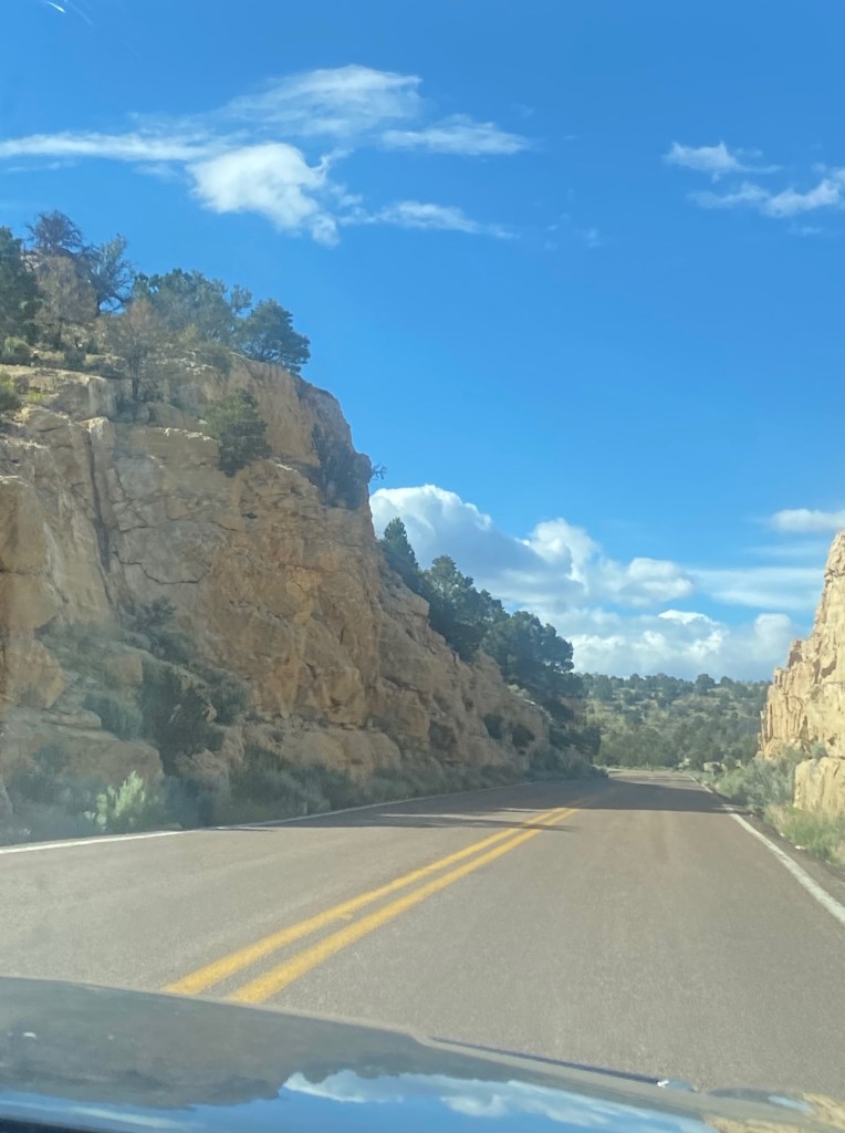 Now back to the canyon. Thom blessed me with the freedom to “ditch him for the ditch,” and I walked the Rim Trail from one visitor center to the other. This walk was absolutely stunning, as I went from one outcropping to another, with ever-changing views. I suspect a lot of my pictures look the same, as pictures don’t do justice to your actual eyes, so you just need to come see this for yourself. The sun was warm, the wind was blowing, I was alone more often than not on the trail, and the cicadas were clacking. I was constantly mesmerized by the beauty of this place. I met back up with Thom after my 90 minute journey (he journeyed the overlook bus lines), and we had a fantastic lunch (while looking at the canyon) at El Tavor. After that, we hit the road for the North Rim.