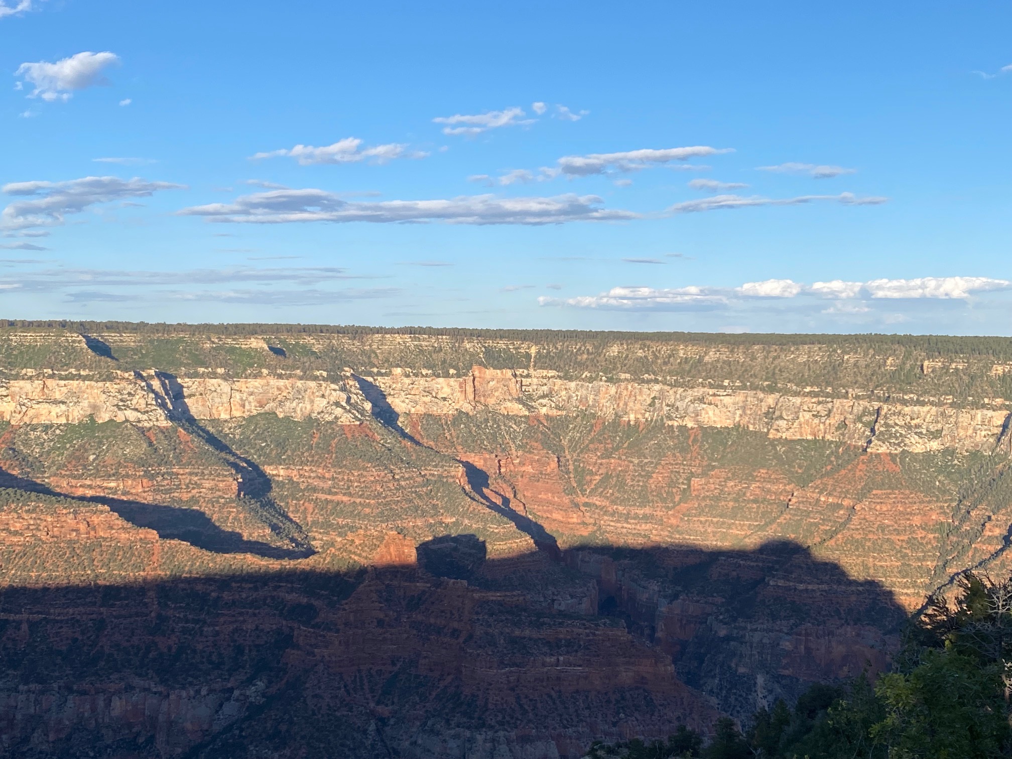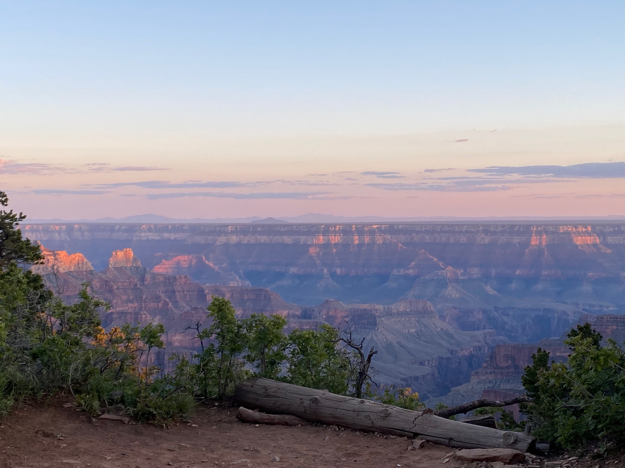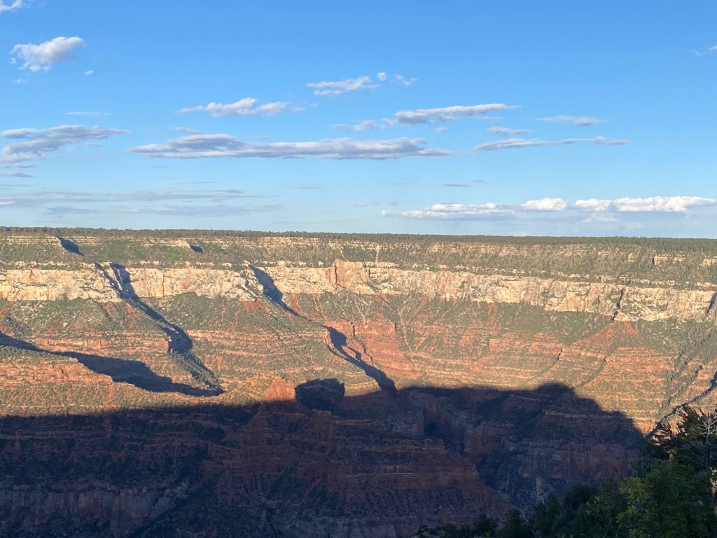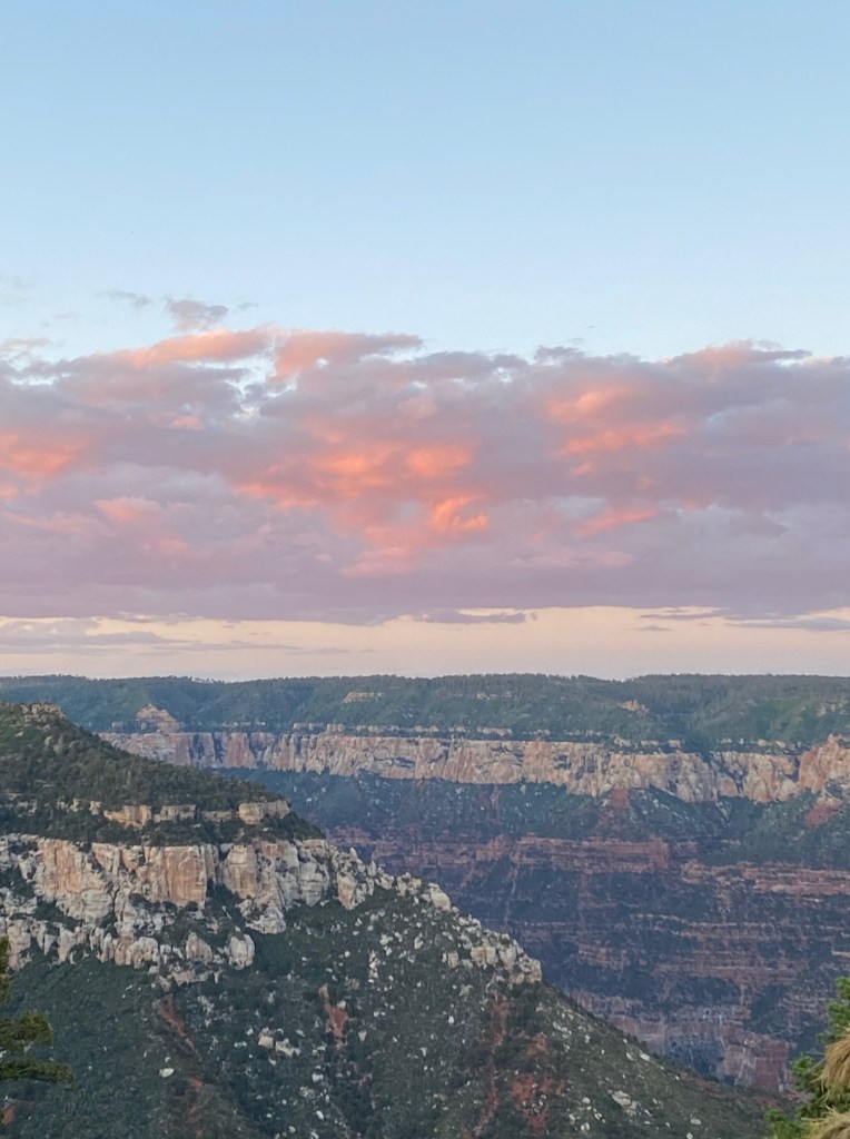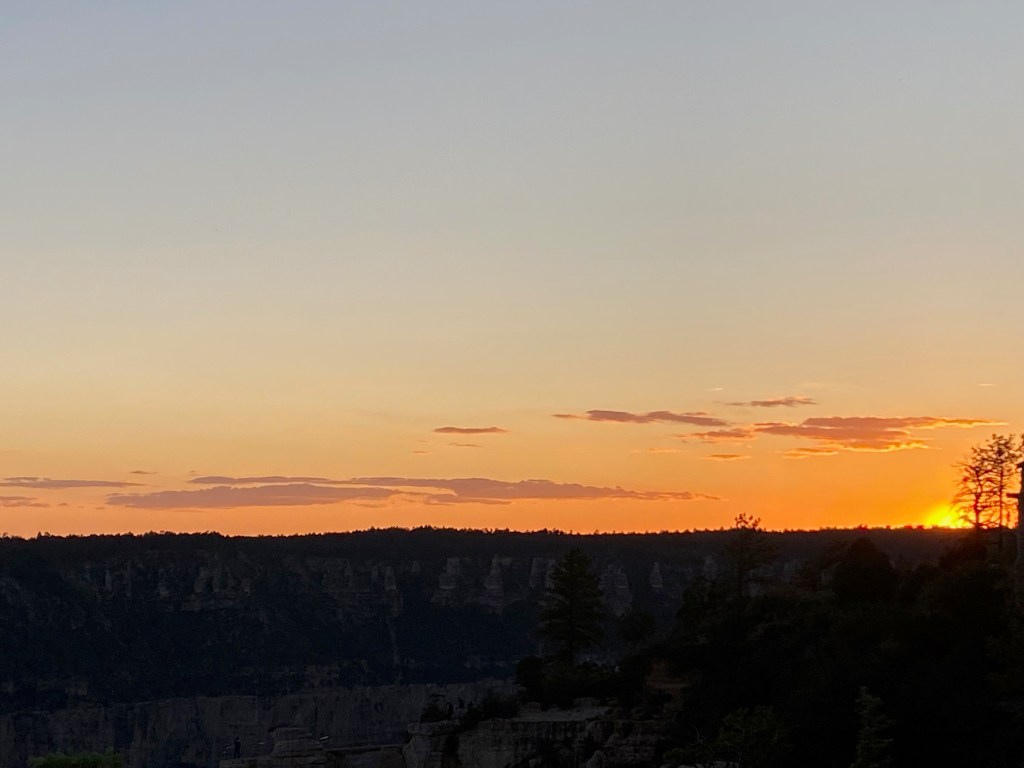 We headed to the North Rim to picnic and watch the sunset. There was no rain tonight, so we got a little different view. The North Rim was more remote, more natural, had more trees, had much steeper trails, but was beautiful in it’s own right. From the Bright Angel overlook, it was clear enough to see the mountains of San Francisco in the distance. It was amazing to watch the shadows grow upwards and the sun went down. As the sun got lower, little spots throughout the canyon looked like they were on fire, and the clouds and other parts of the canyon turned lovely shades of blues and purples. It was such a beautiful end to a perfect day.