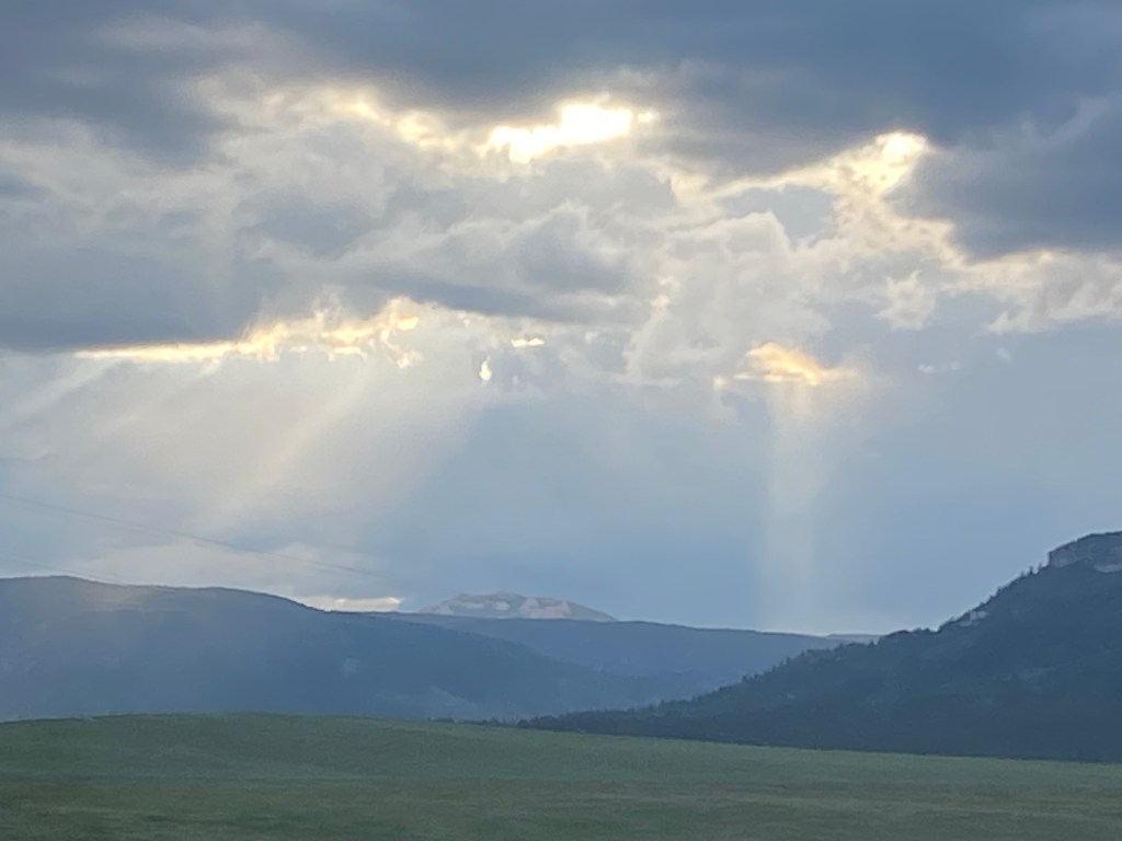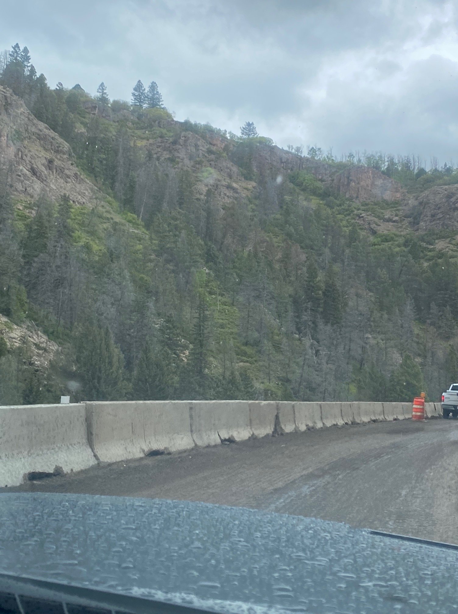 While we waited our turn for the one lane section, we got to witness the wild Colorado weather. It was a beautiful, sunny day with a few clouds, but then we watched a big cloud in the distance moving our way and you could see it snowing up high, then raining as it moved towards us and then over us. The temperature dropped from 65 to 48 in a matter of minutes and then we got pea-sized hail for a good five minutes before it turned back to rain…and then the cloud was gone. Ah, the poor car today!