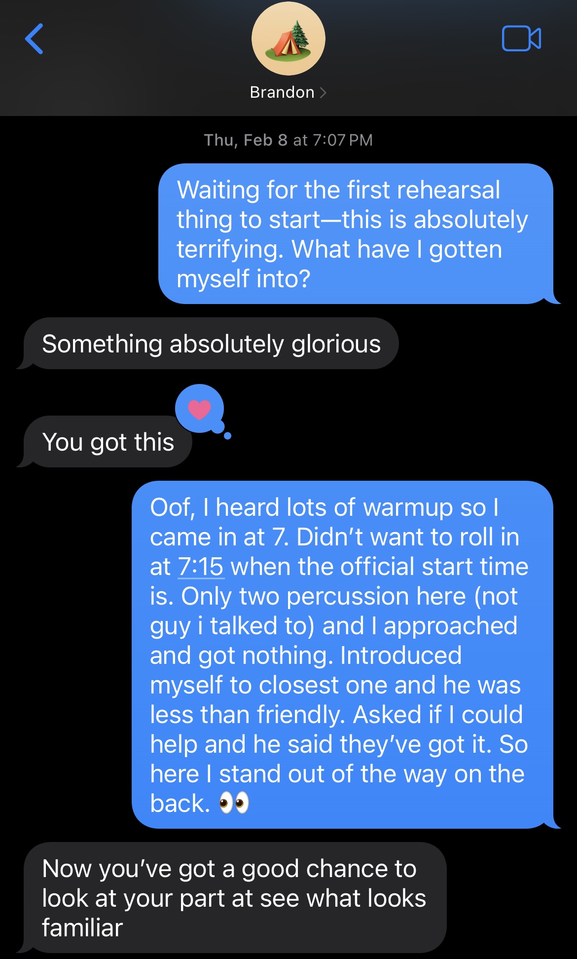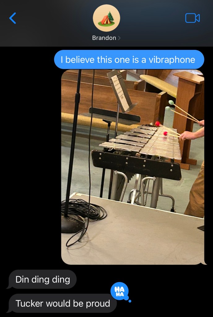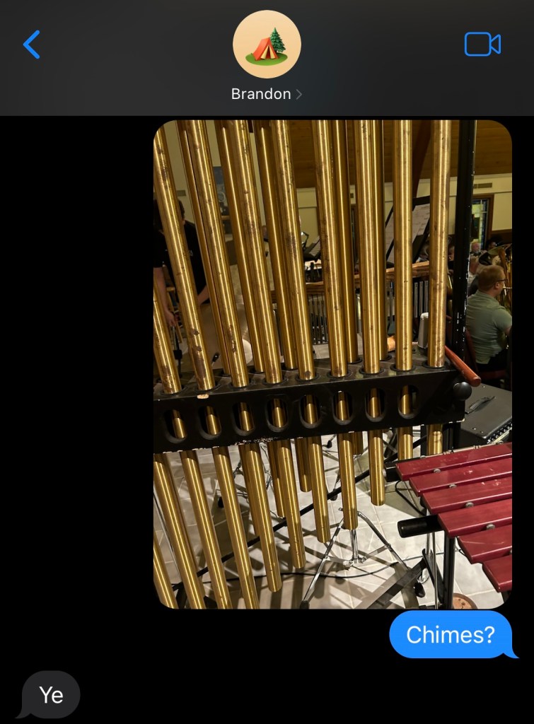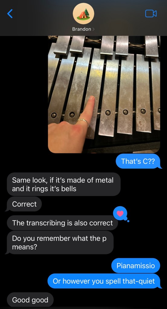 The people I had talked to (over email or phone) weren’t there yet, so I nervously went up to the percussionists who were there and introduced myself. They were busy setting up, so I promptly found myself awkwardly standing there not knowing what to do. Panic was knocking at my door, so I texted Brandon. I offloaded my stress and he fed me positivity.