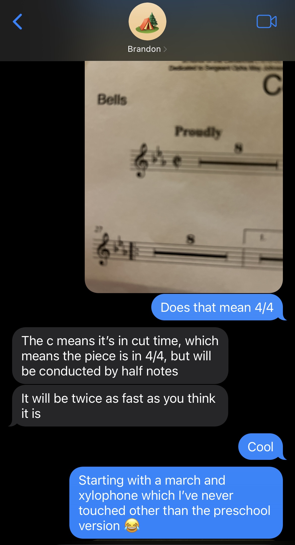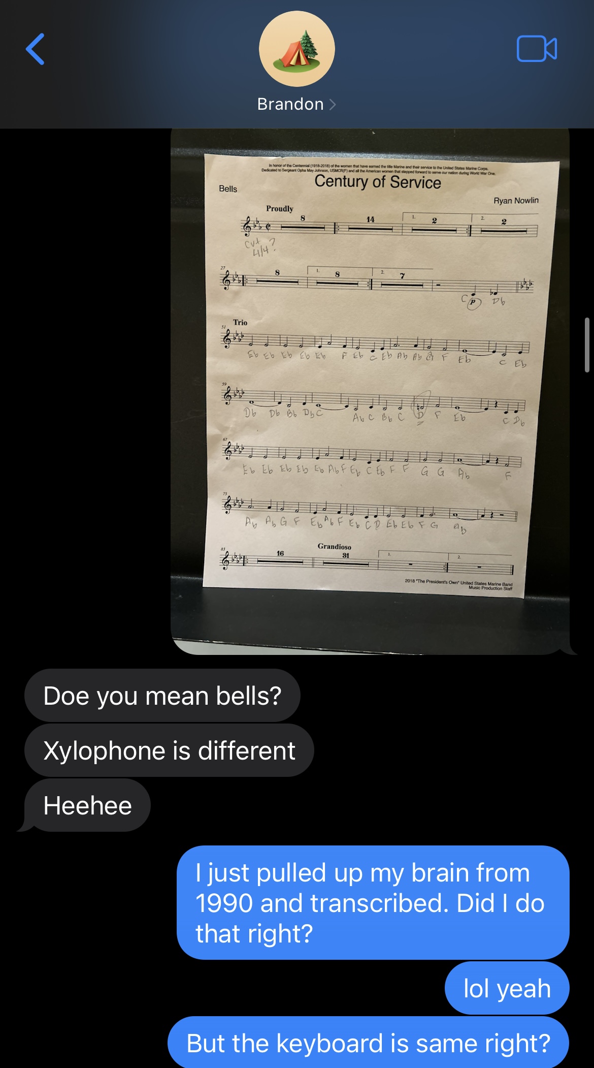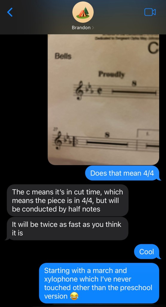 I hadn’t even imagined that I would be thrown into playing right on the spot. I looked at that sheet music (which might as well have been hieroglyphics) and at the instrument in front of me (that I’ve never played), and I knew there was no way I was playing along with the band in a few moments. I also knew I couldn’t just stand there doing nothing. So, I decided to pull out a pencil and start deciphering the music at whatever level I could. Thankfully, some of my ancient music knowledge came back to me as I stared at that page. I recalled the good old acronyms of Every Good Boy Does Fine and FACE, so I started writing note names under each note. I somehow remembered the key signatures and remembered the flat order of BEADGCF and started writing flats next to the appropriate note names I’d written. I started circling repeats and dynamics. I was perplexed by the time signature (which I had never seen before) and texted Brandon who gave me a quick response about Cut Time. I sent him a picture of my quick transcription to get confirmation that I was on the right track. We also had a quick photo exchange where he helped me get straight all the different instruments. Brandon was a life saver in these moments.