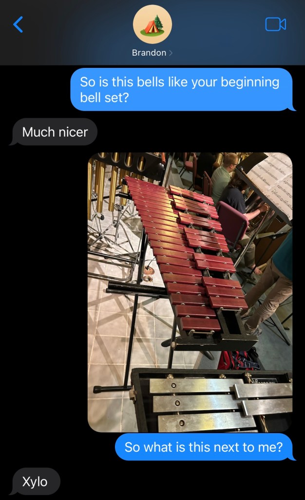 I was able to recall the layout of a keyboard and started tapping a few notes of the music with my hands before the band was done with that piece and ready to move on. I took a breath of relief that only lasted a moment, as I was then handed another piece of music and told to play bass drum. And this is how the evening progressed–sight reading to music I didn’t know, playing on instruments I’d never touched, and realizing how hard it was to count the rests (with all the changing tempos and time signatures). It was an emotional roller coaster of anxiety with each new piece and brief relief at the end of each song. By the end of those two hours, I had been given five pieces of music playing on bells, bass drum, suspended cymbal, chimes, and xylophone. I tried to play where I could, but it was super messy at best. It was an exhausting experience that was a true trial by fire.