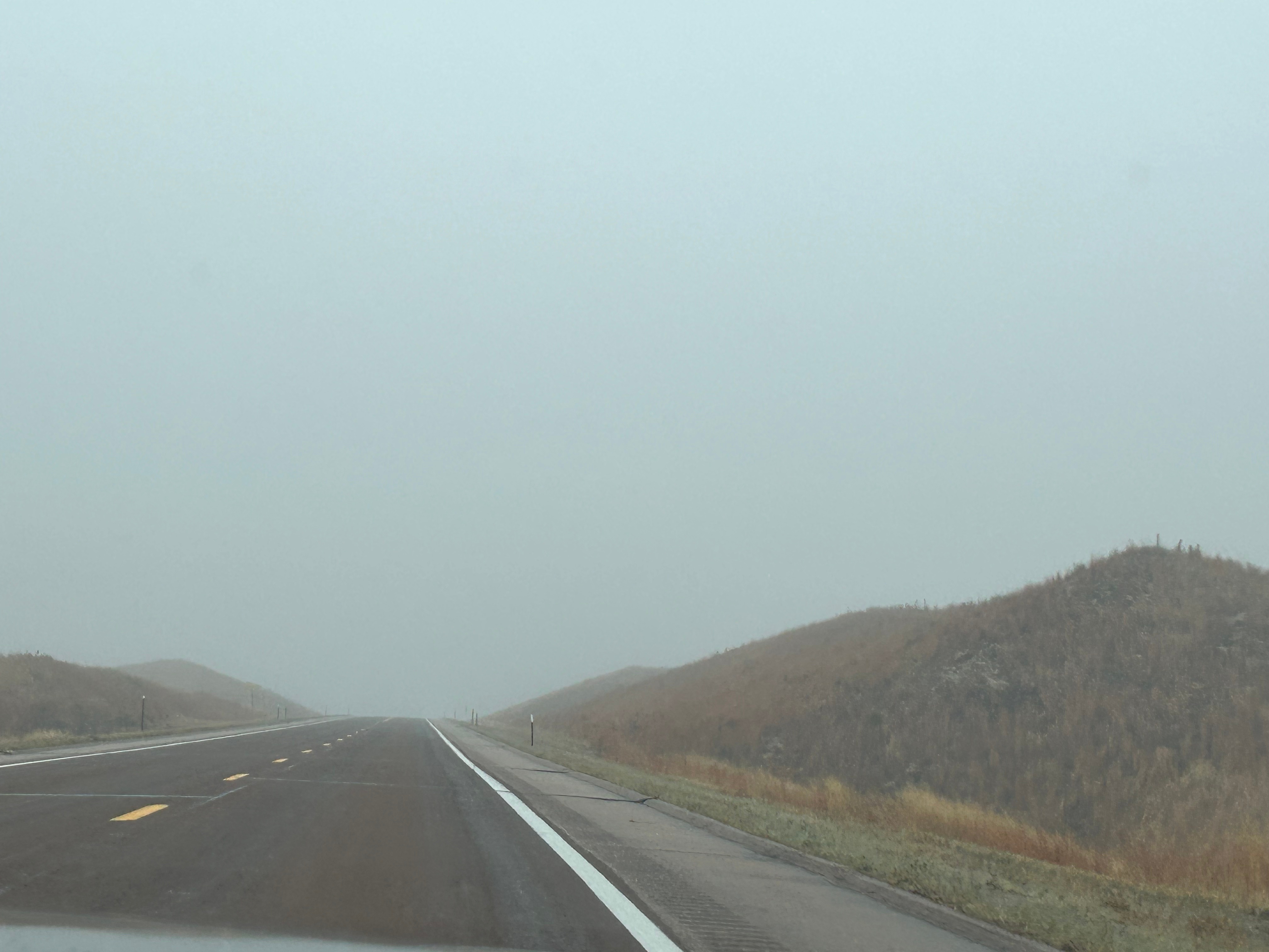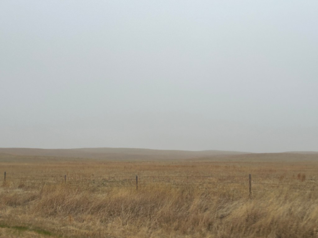 Soon, the landscape changed to rolling, sandy hills. Thom pointed out that it almost looked like dunes in a desert except for the grasses growing on the hills. Turns out, we were in an area of Nebraska known as the Sandhills Region. Apparently this area covers nearly a quarter of Nebraska and is the largest grass-stabilized sand dune field in North America. As is often the case, this picture doesn’t really do it justice, and the weather made pictures a little more challenging.