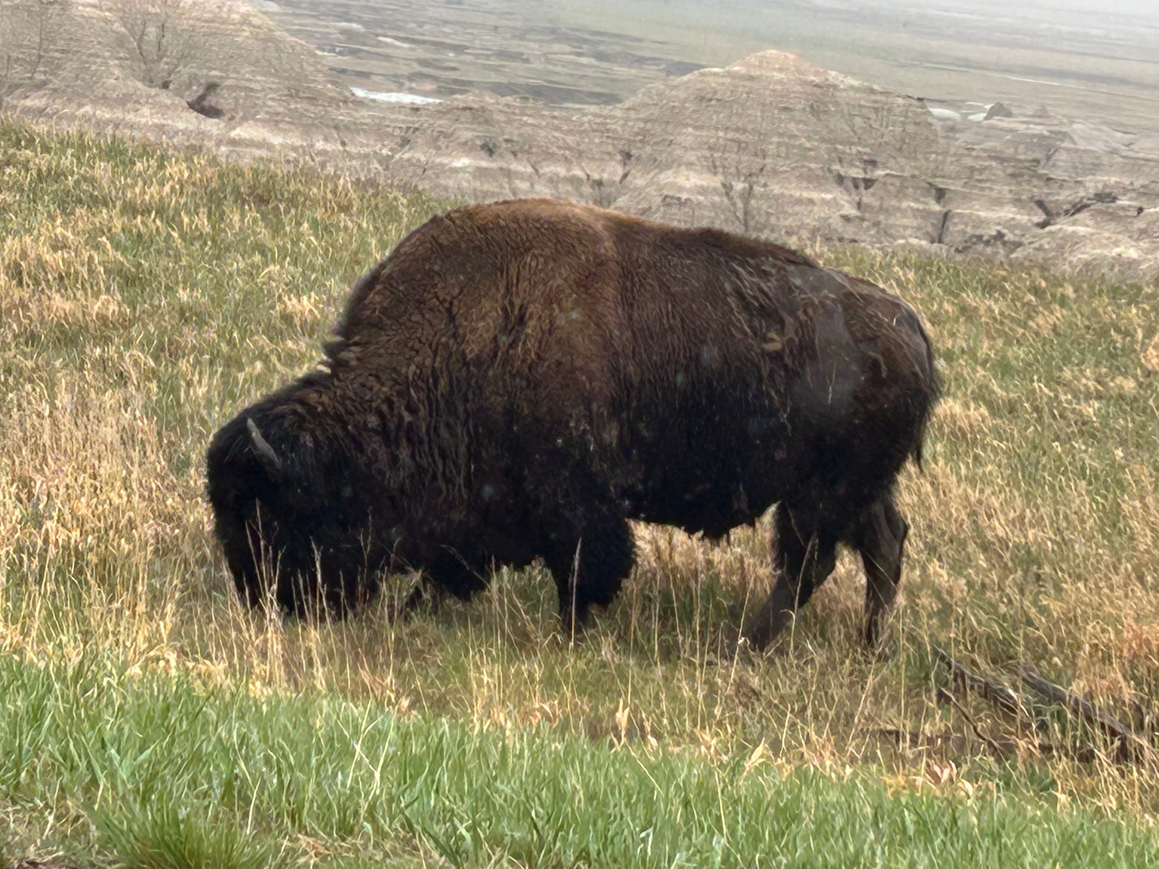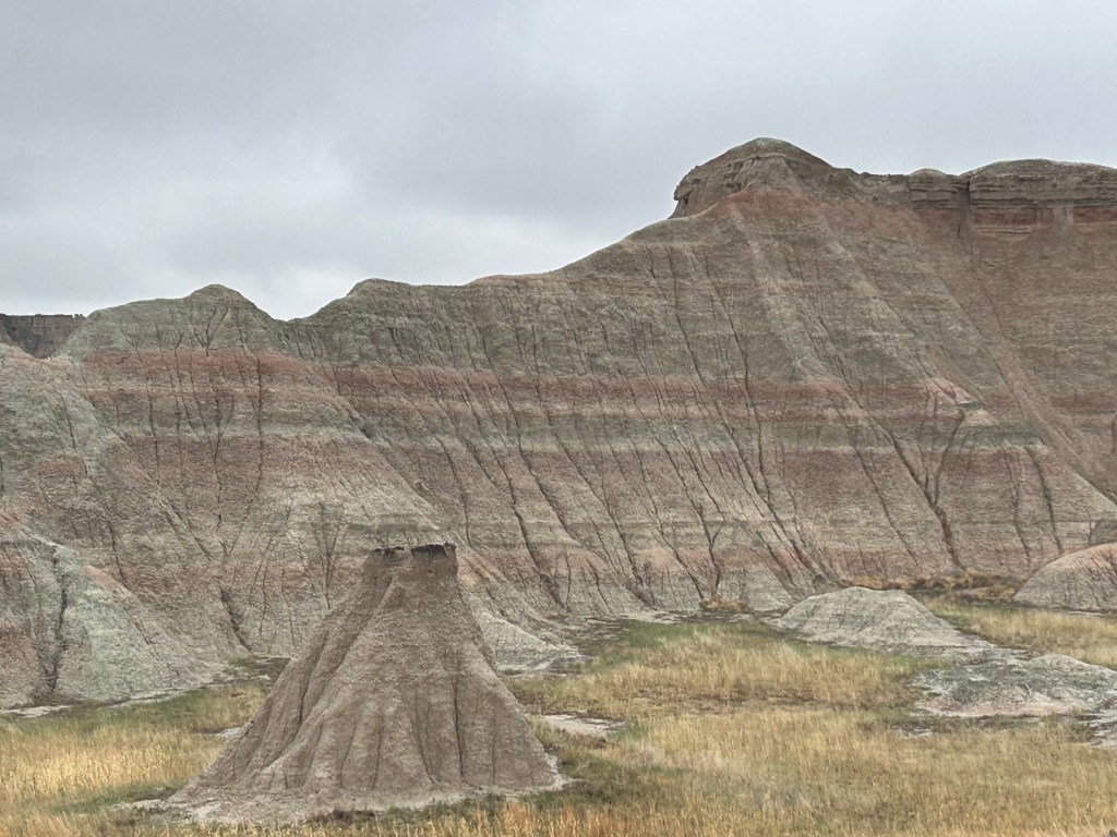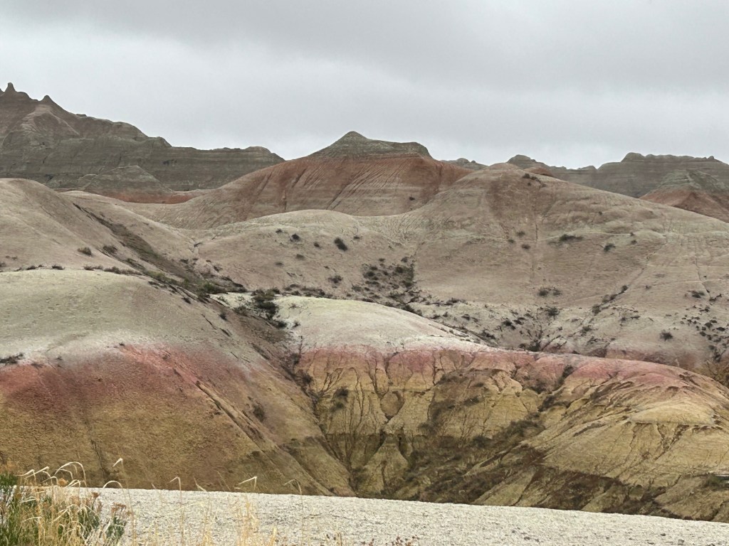 Then, somehow out of nowhere, the landscape changed, and we were in the Badlands. After the obligatory visitor center stop, we took the loop road through the park. It was cold and windy with low clouds, so we didn’t visit any of the overlooks. I’ll bet this place is even more stunning on a clear day where you can see across the vast vistas. It was still such an amazing place, with color and formation changes around every turn. The buttes, peaks, and gullies were all interspersed with the surrounding prairies. Even without the sun shining on the formations, you could see more colors than you could count. Despite the weather, we got to see some bison grazing along the roadside. We also saw the mounds where prairie dogs and black-footed ferrets live, but they seemed to be hiding from the weather.