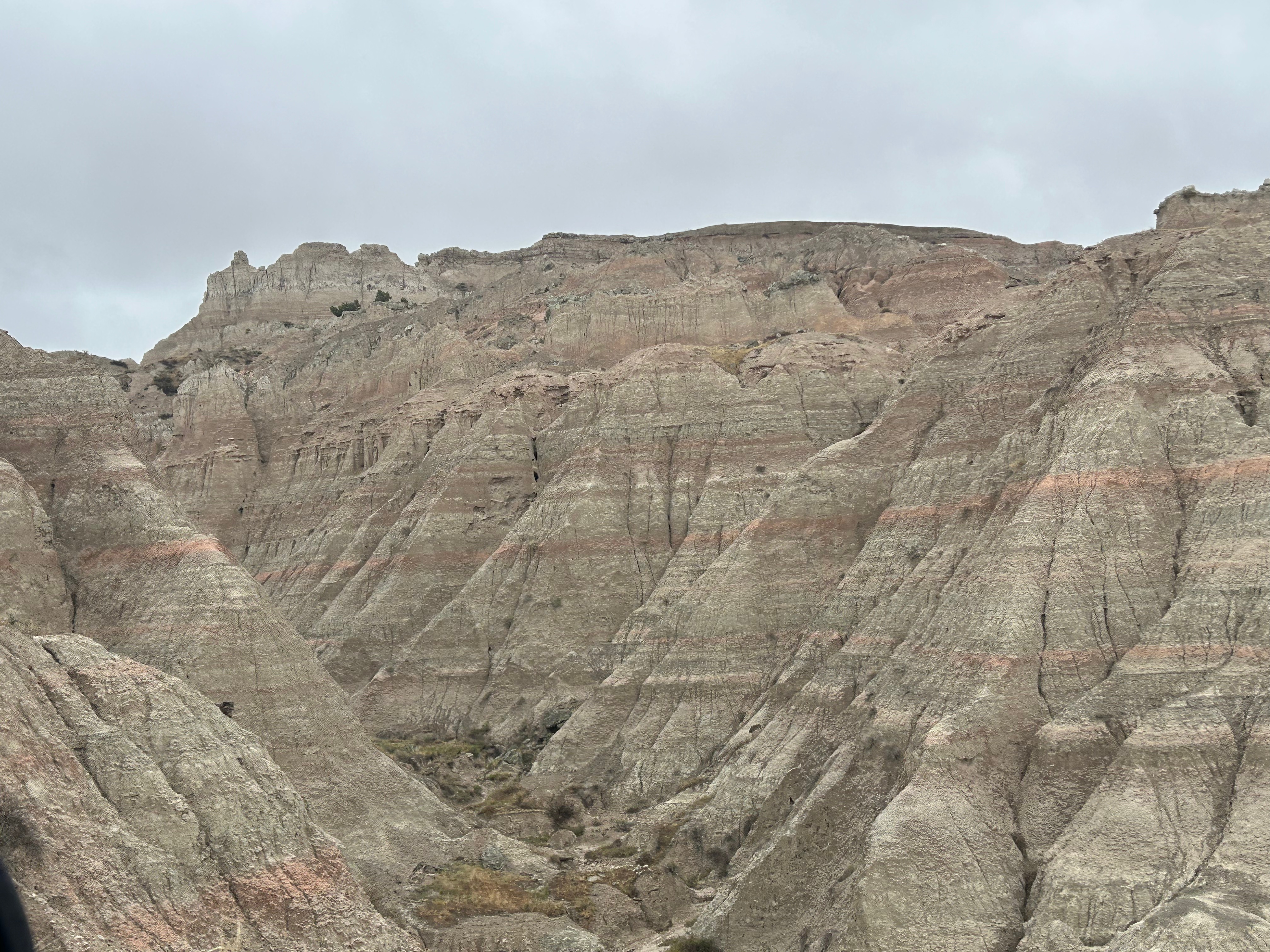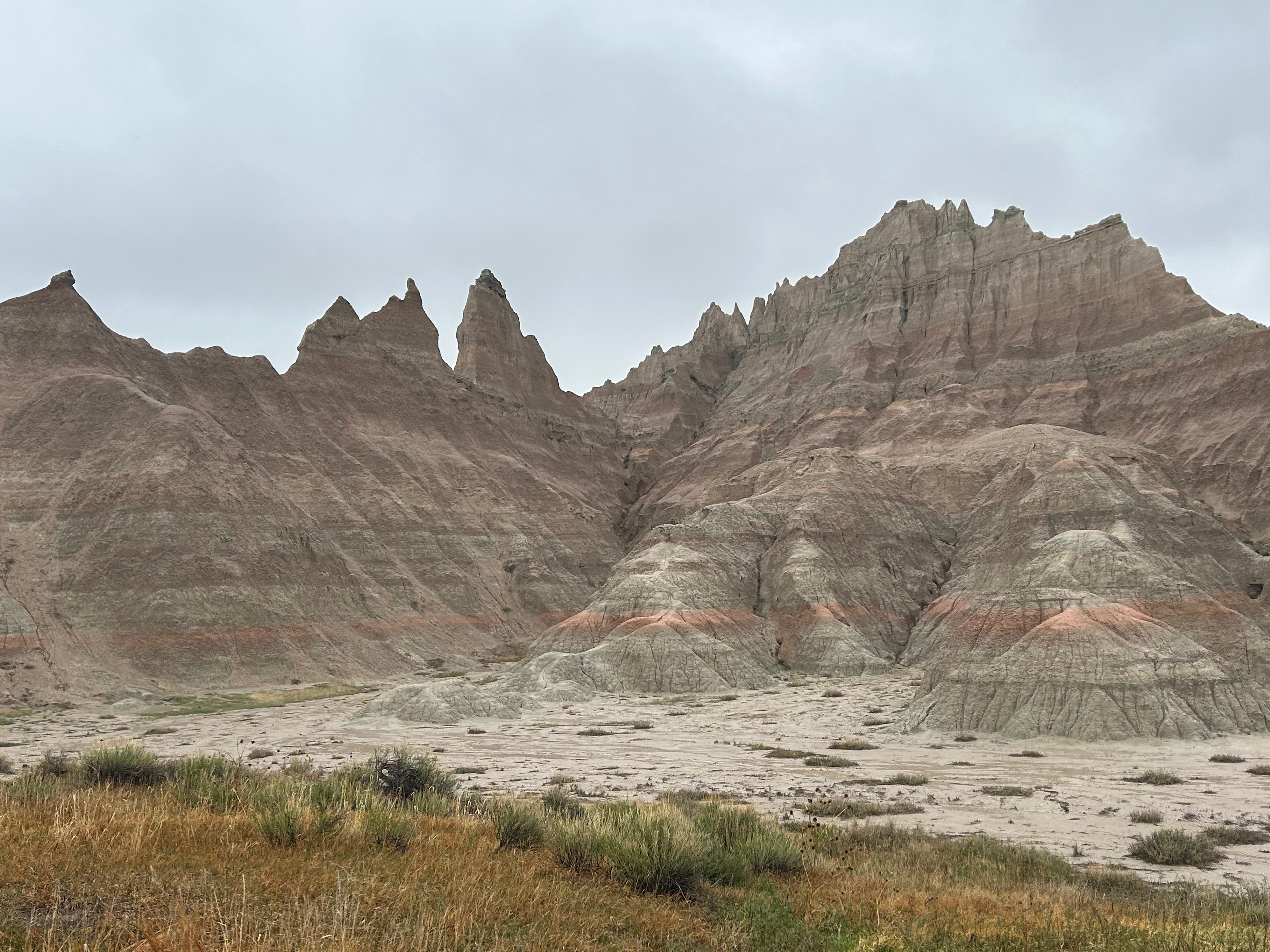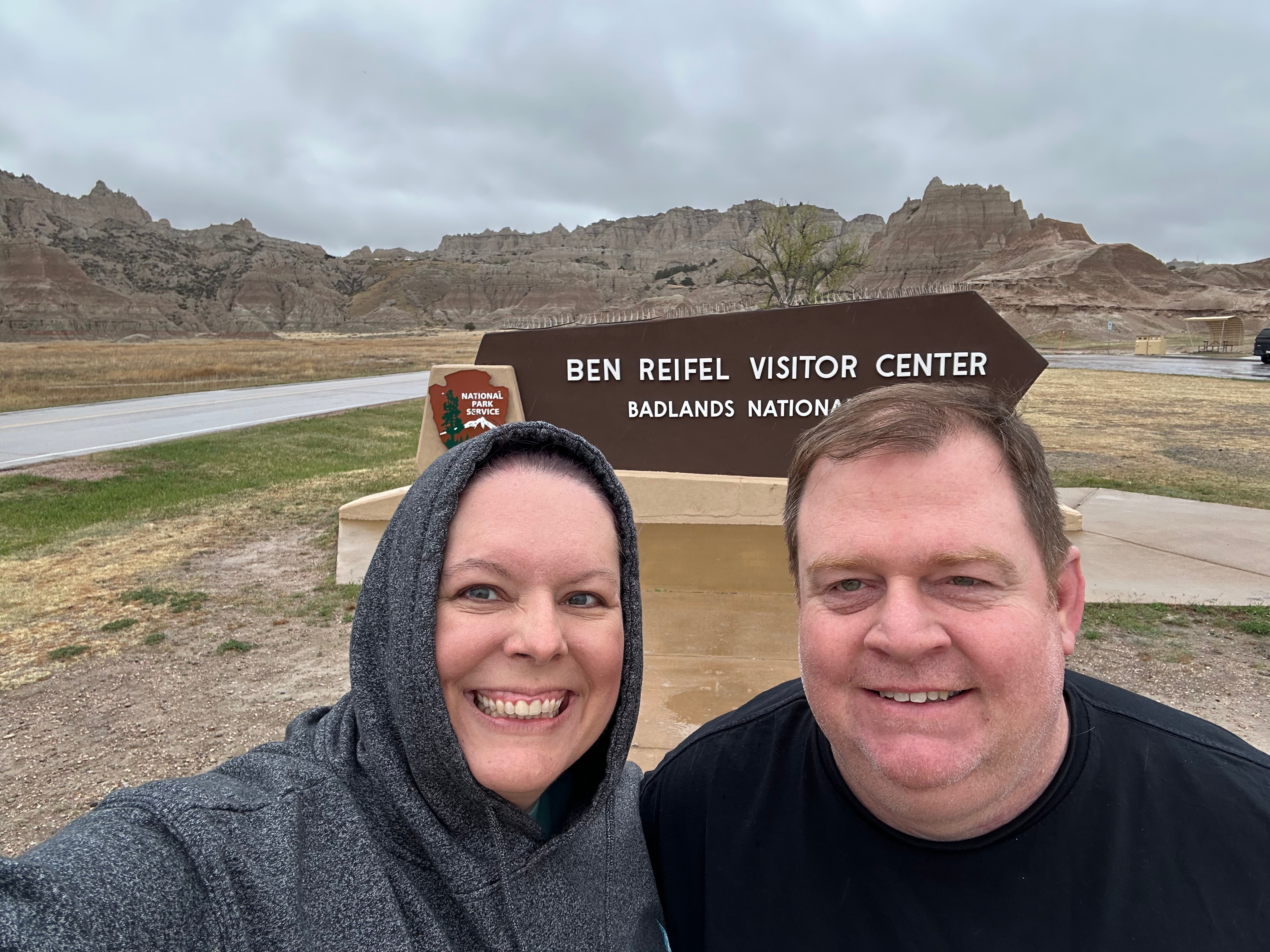 Then, somehow out of nowhere, the landscape changed, and we were in the Badlands. After the obligatory visitor center stop, we took the loop road through the park. It was cold and windy with low clouds, so we didn’t visit any of the overlooks. I’ll bet this place is even more stunning on a clear day where you can see across the vast vistas. It was still such an amazing place, with color and formation changes around every turn. The buttes, peaks, and gullies were all interspersed with the surrounding prairies. Even without the sun shining on the formations, you could see more colors than you could count. Despite the weather, we got to see some bison grazing along the roadside. We also saw the mounds where prairie dogs and black-footed ferrets live, but they seemed to be hiding from the weather.