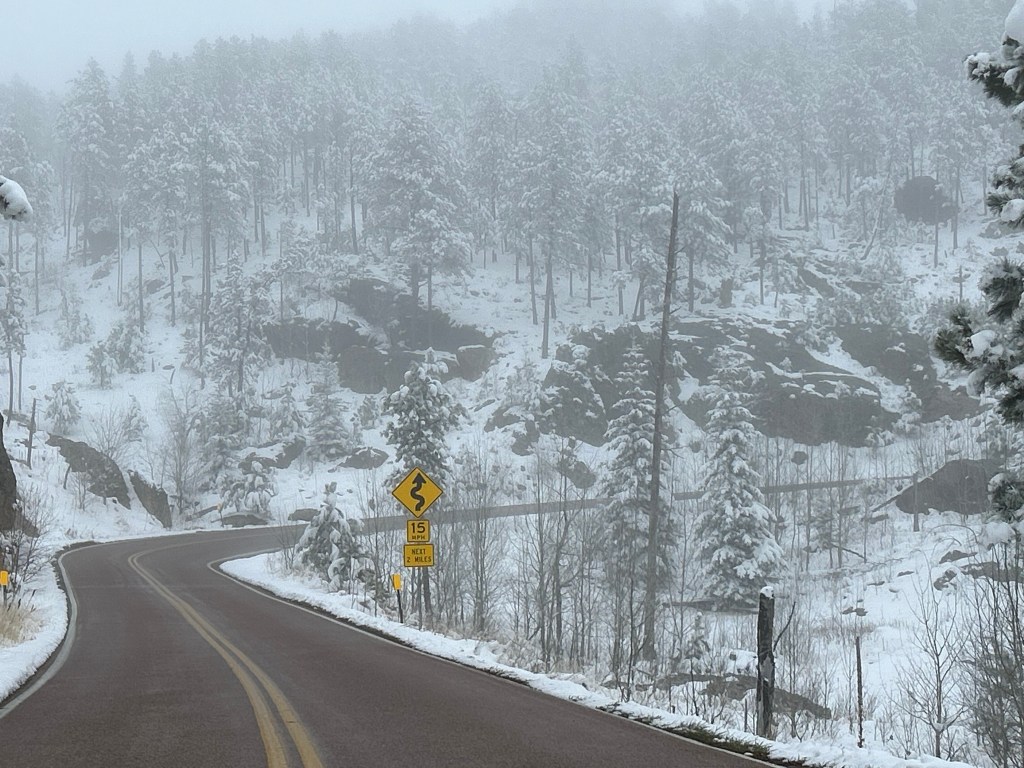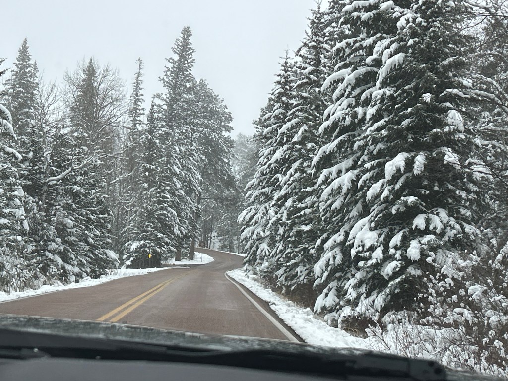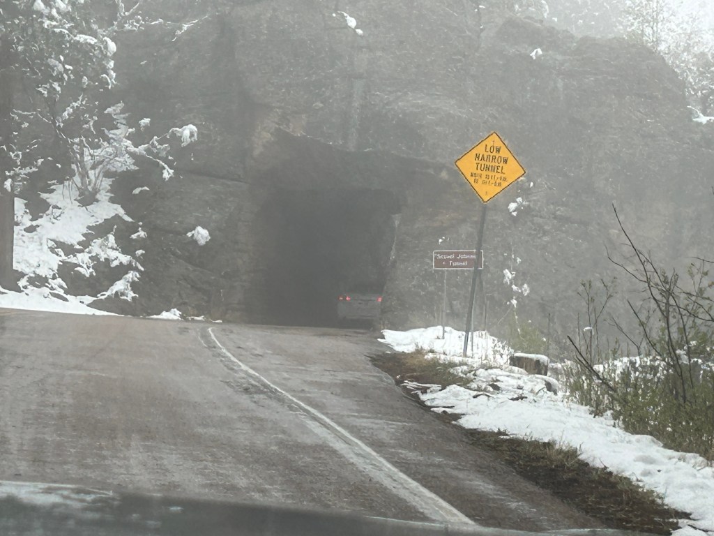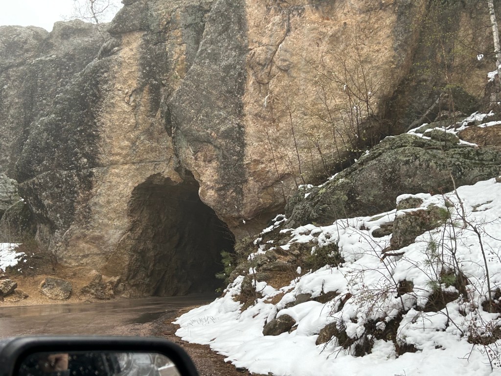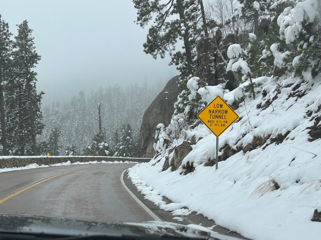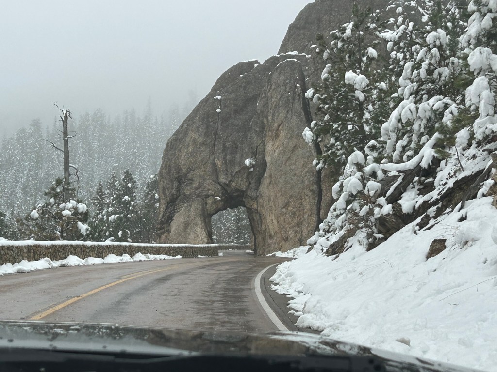 It looked like we had burned just enough time to venture towards the Black Hills National Forest after the morning’s snow. The Iron Mountain Road in the Black Hills is what brought us to South Dakota to begin with. Thom was eager to drive this road, and I was eager to see the views. We’d watched some YouTube videos of others driving this road, and the tunnels seemed cool–especially the one where you can see Mount Rushmore through the tunnel. The roads were still wet from the morning snow but, as with every road we’d encountered, it seemed like all roads were treated well and frequently. So off we (cautiously went).