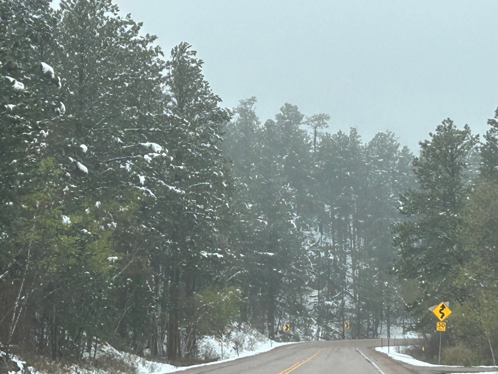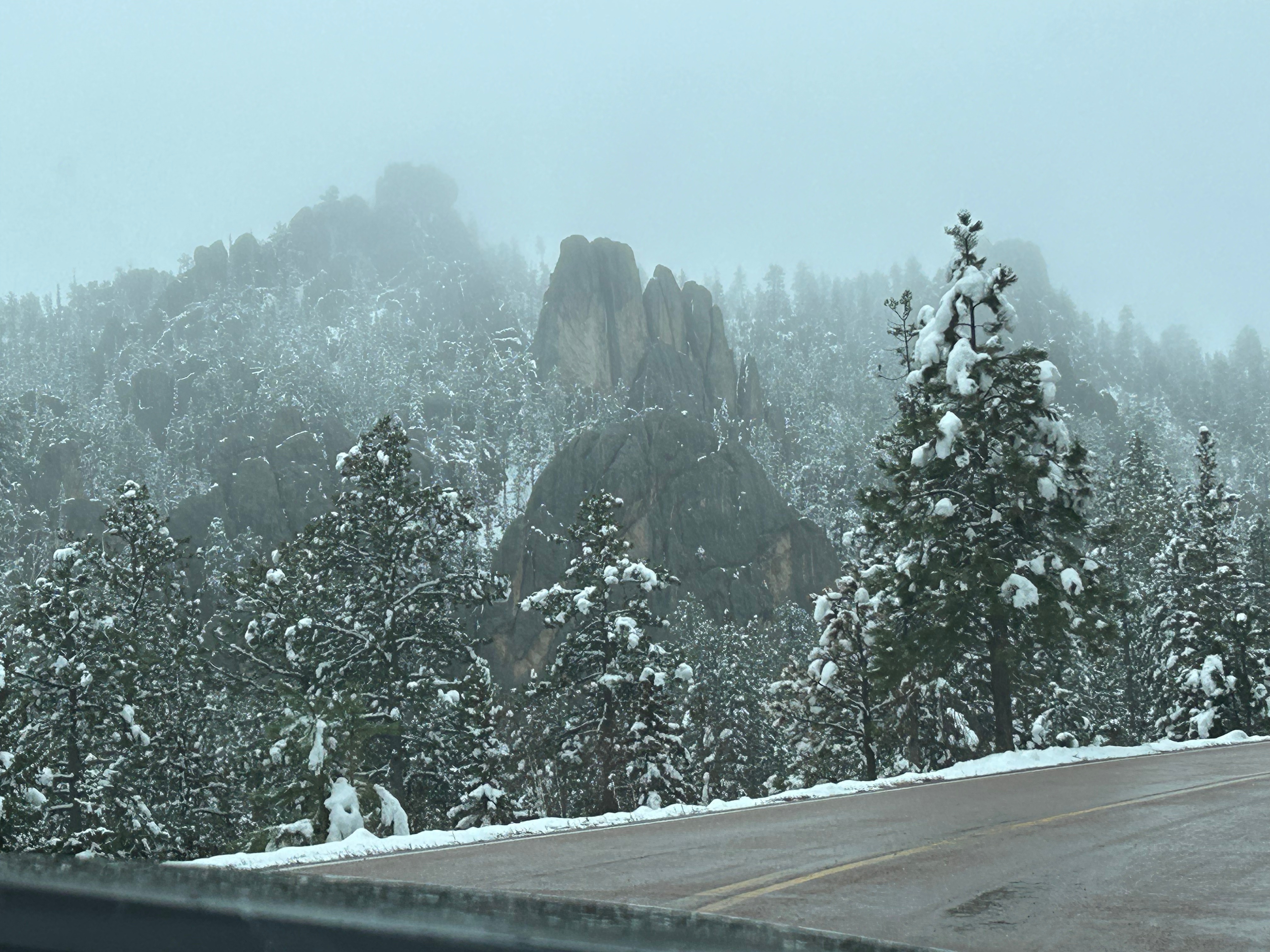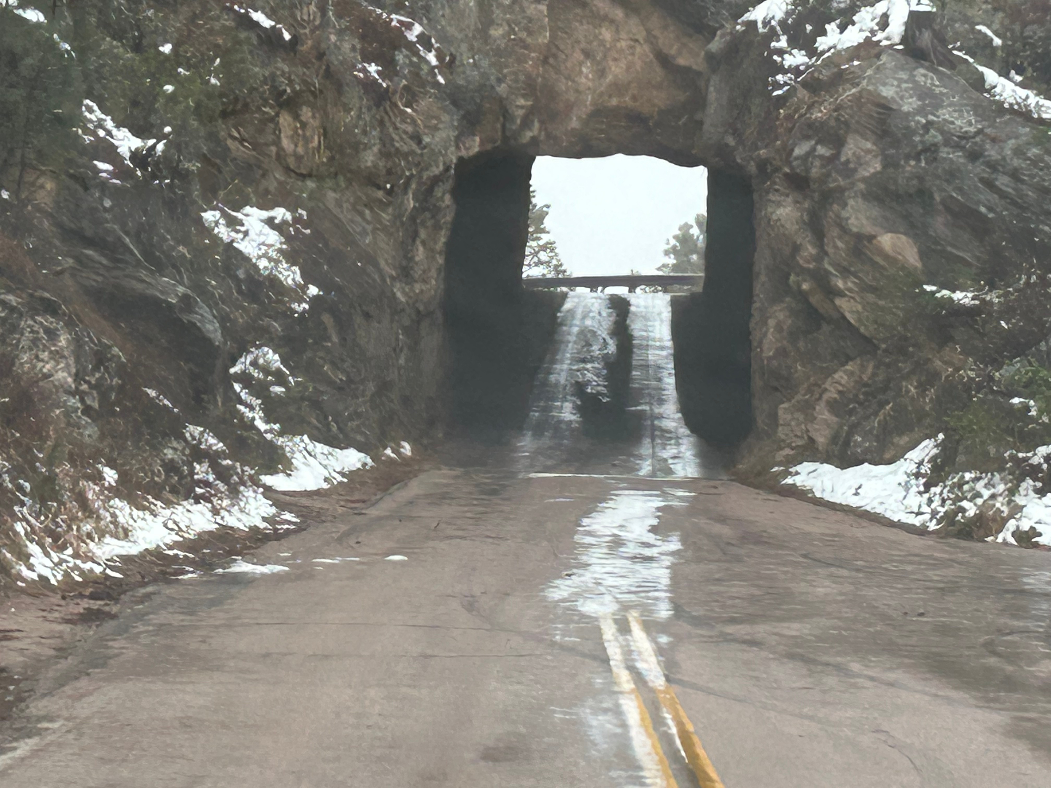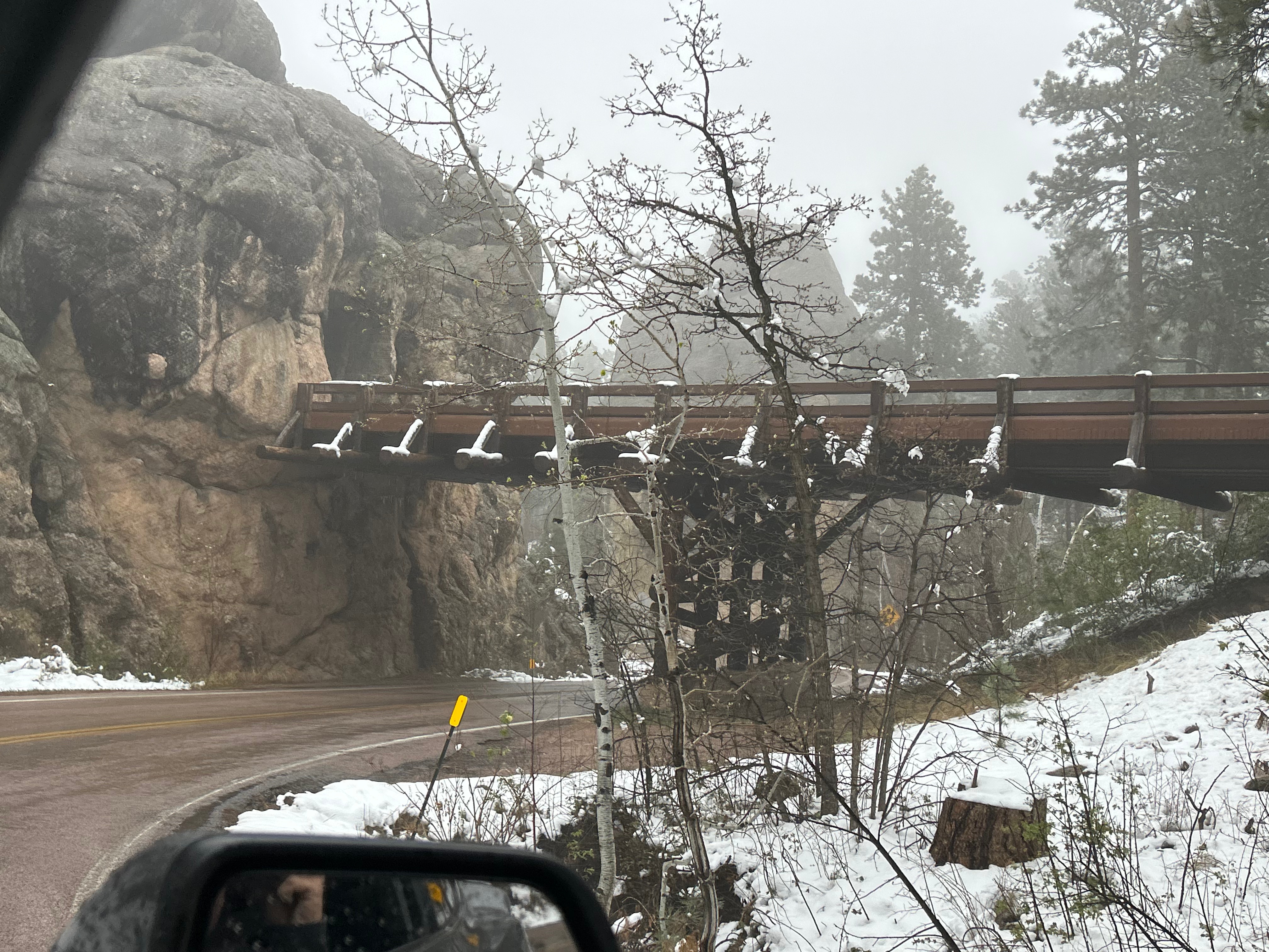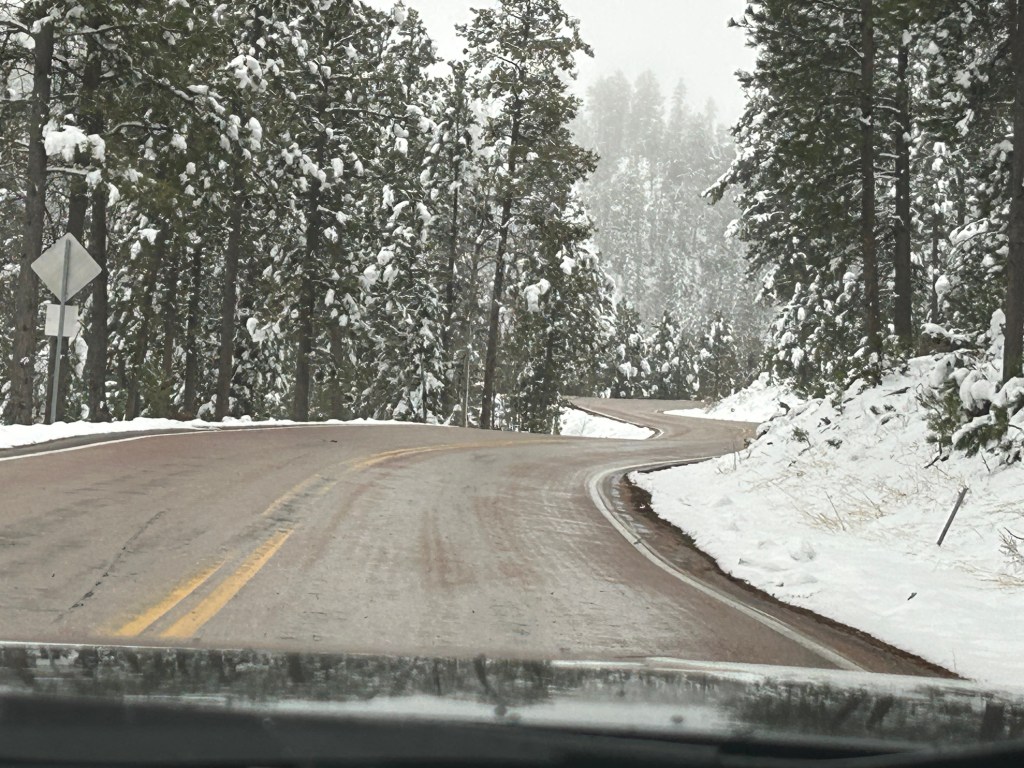 It looked like we had burned just enough time to venture towards the Black Hills National Forest after the morning’s snow. The Iron Mountain Road in the Black Hills is what brought us to South Dakota to begin with. Thom was eager to drive this road, and I was eager to see the views. We’d watched some YouTube videos of others driving this road, and the tunnels seemed cool–especially the one where you can see Mount Rushmore through the tunnel. The roads were still wet from the morning snow but, as with every road we’d encountered, it seemed like all roads were treated well and frequently. So off we (cautiously went).