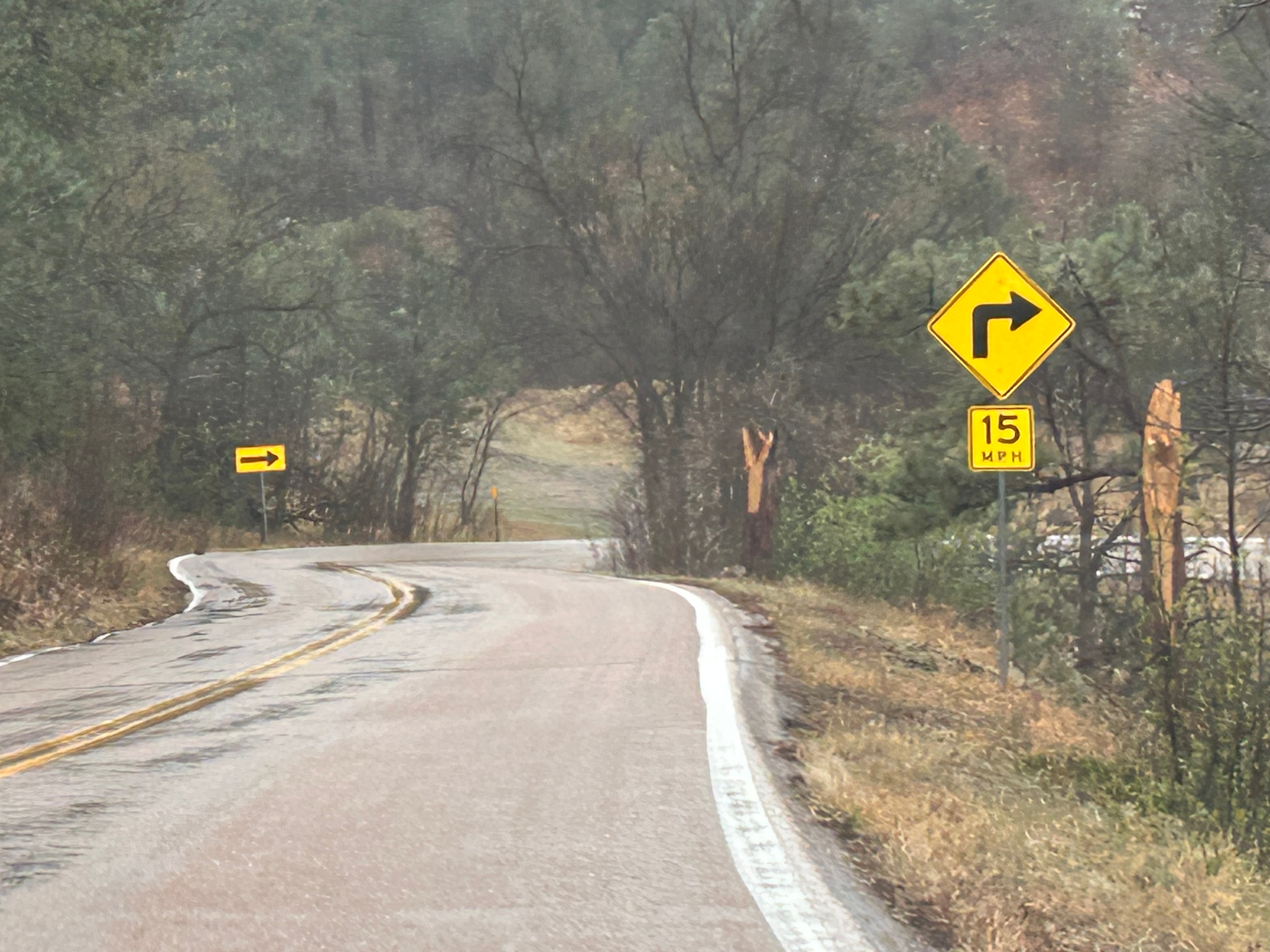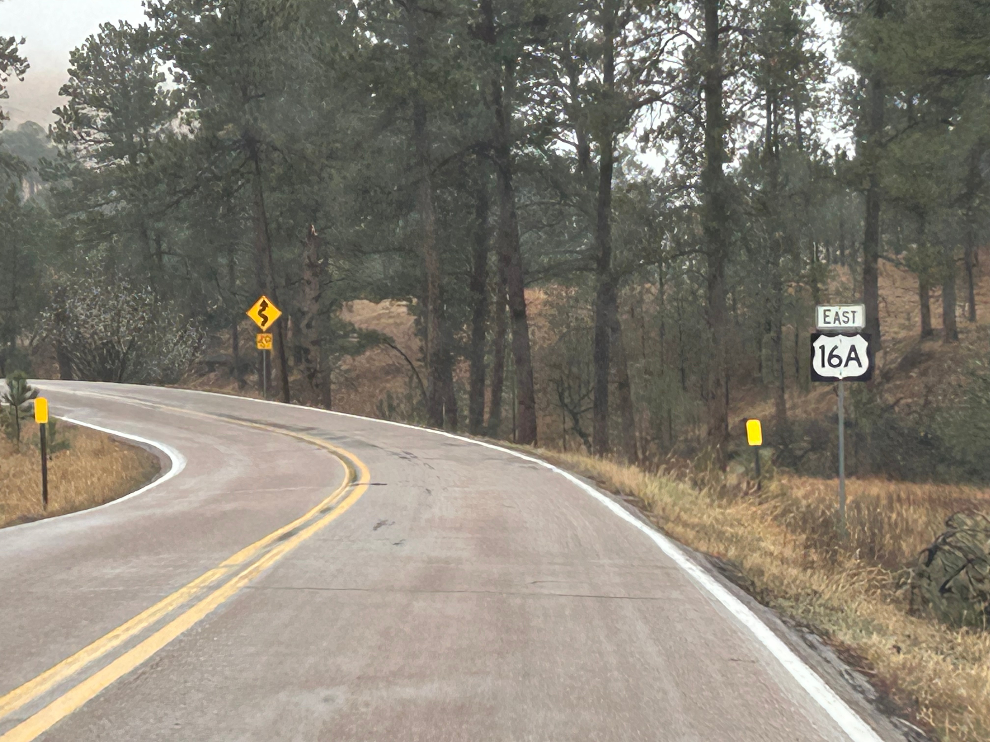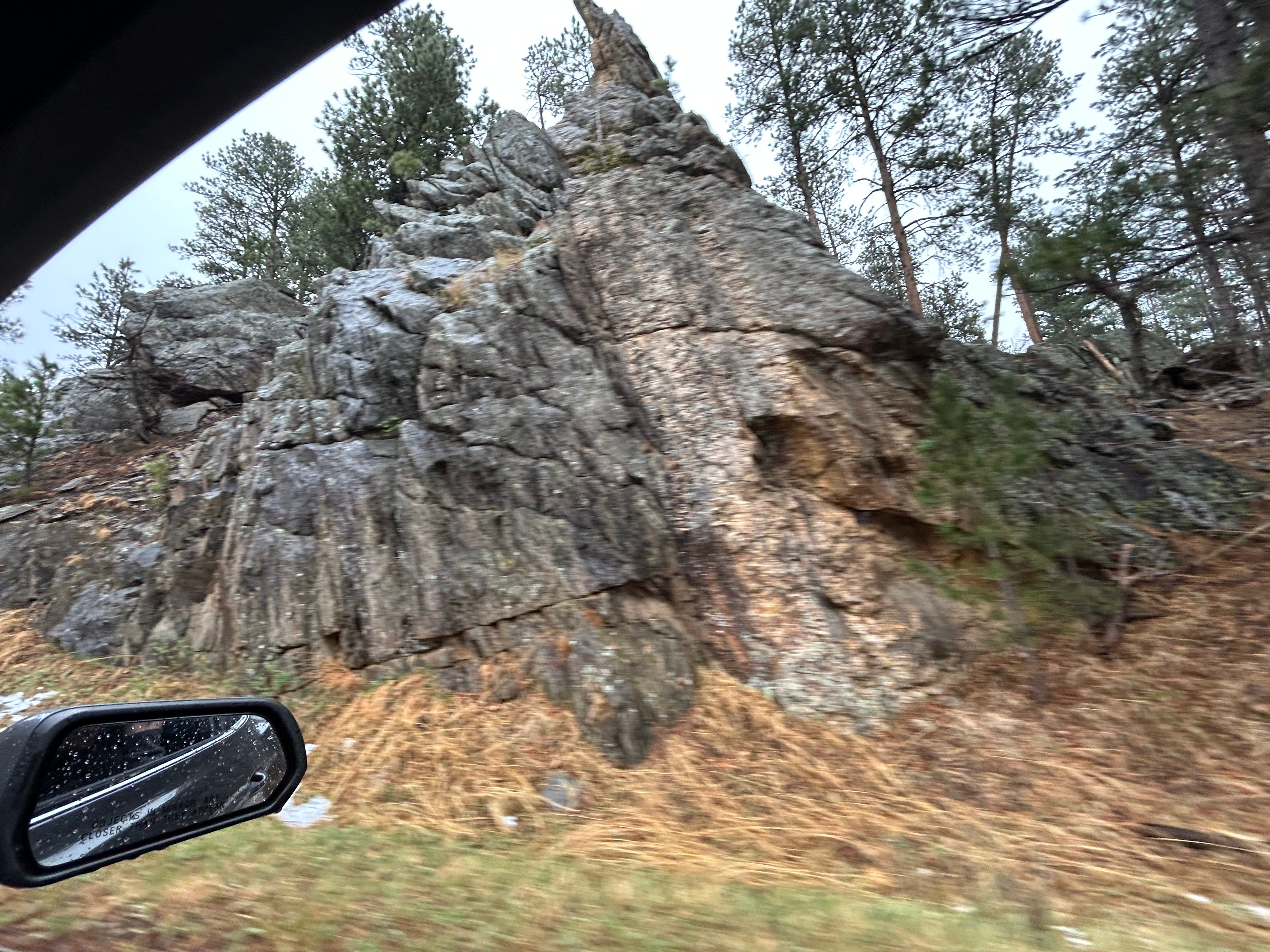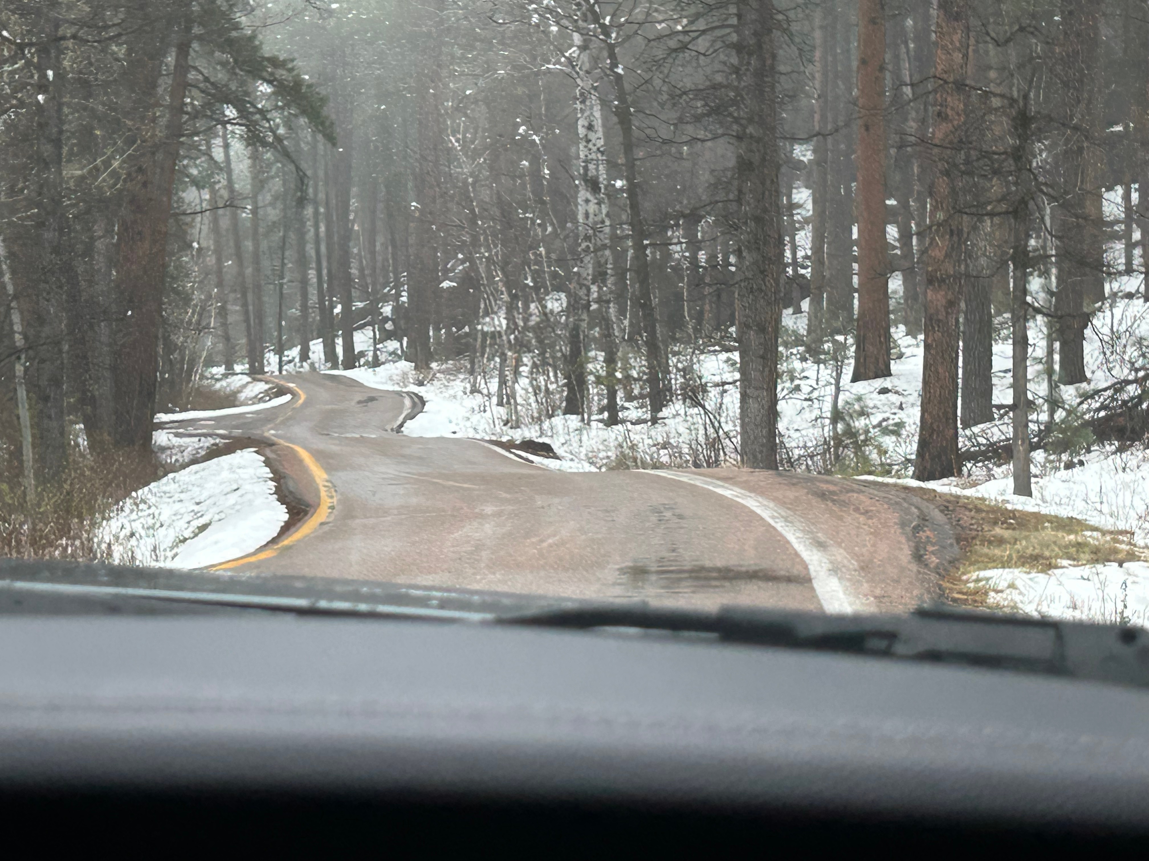 It looked like we had burned just enough time to venture towards the Black Hills National Forest after the morning’s snow. The Iron Mountain Road in the Black Hills is what brought us to South Dakota to begin with. Thom was eager to drive this road, and I was eager to see the views. We’d watched some YouTube videos of others driving this road, and the tunnels seemed cool–especially the one where you can see Mount Rushmore through the tunnel. The roads were still wet from the morning snow but, as with every road we’d encountered, it seemed like all roads were treated well and frequently. So off we (cautiously went).