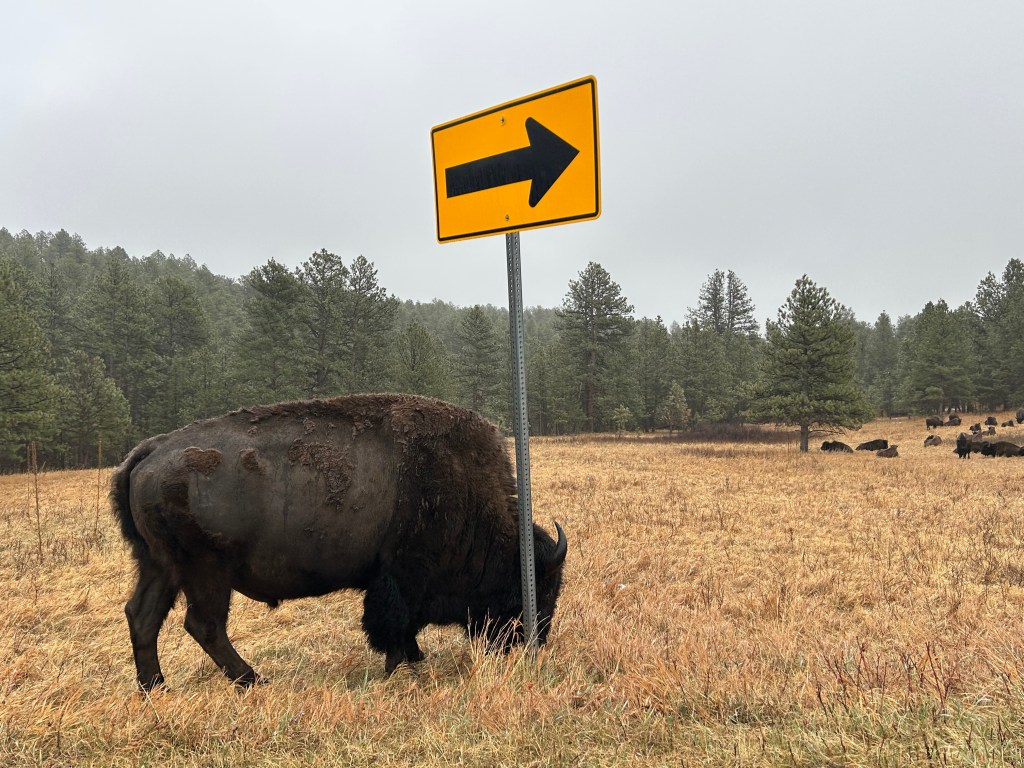 The Iron Mountain Road is a 17-mile stretch featuring 314 curves, 14 switchbacks, 3 pigtails, and 3 tunnels. Oh, and there are countless animals…some of which could be standing in the road when you round a corner. We saw so many animals, many of which we captured pictures of: bison, deer, turkeys, vultures, and antelope. Sadly, we didn’t see any of the big horn sheep. And if all of this wasn’t challenge enough, we were making an elevation gain of about 1000 feet…putting us squarely into areas of deep snow and dropping temperatures. Thom took it really easy and we just enjoyed the ride.