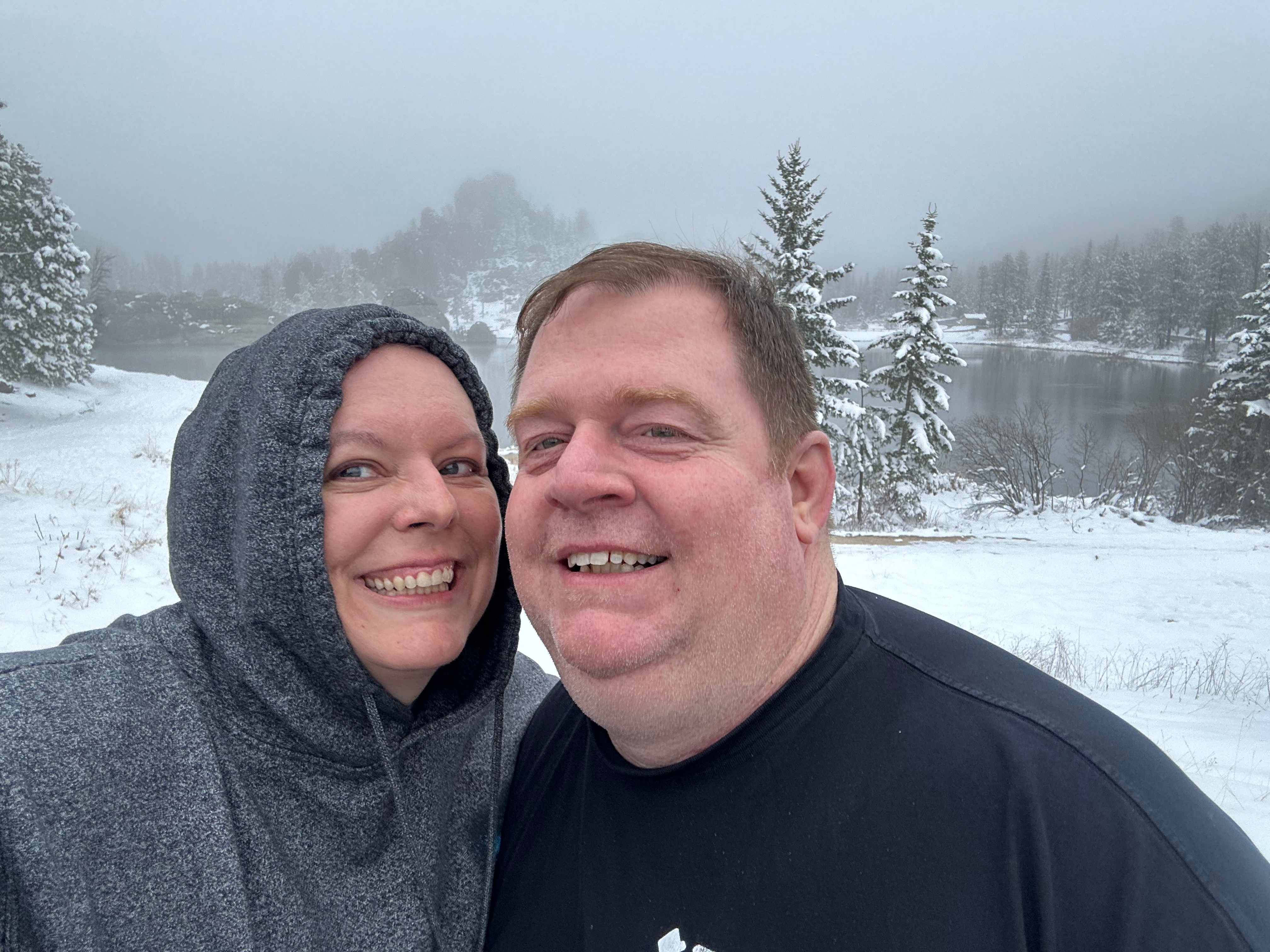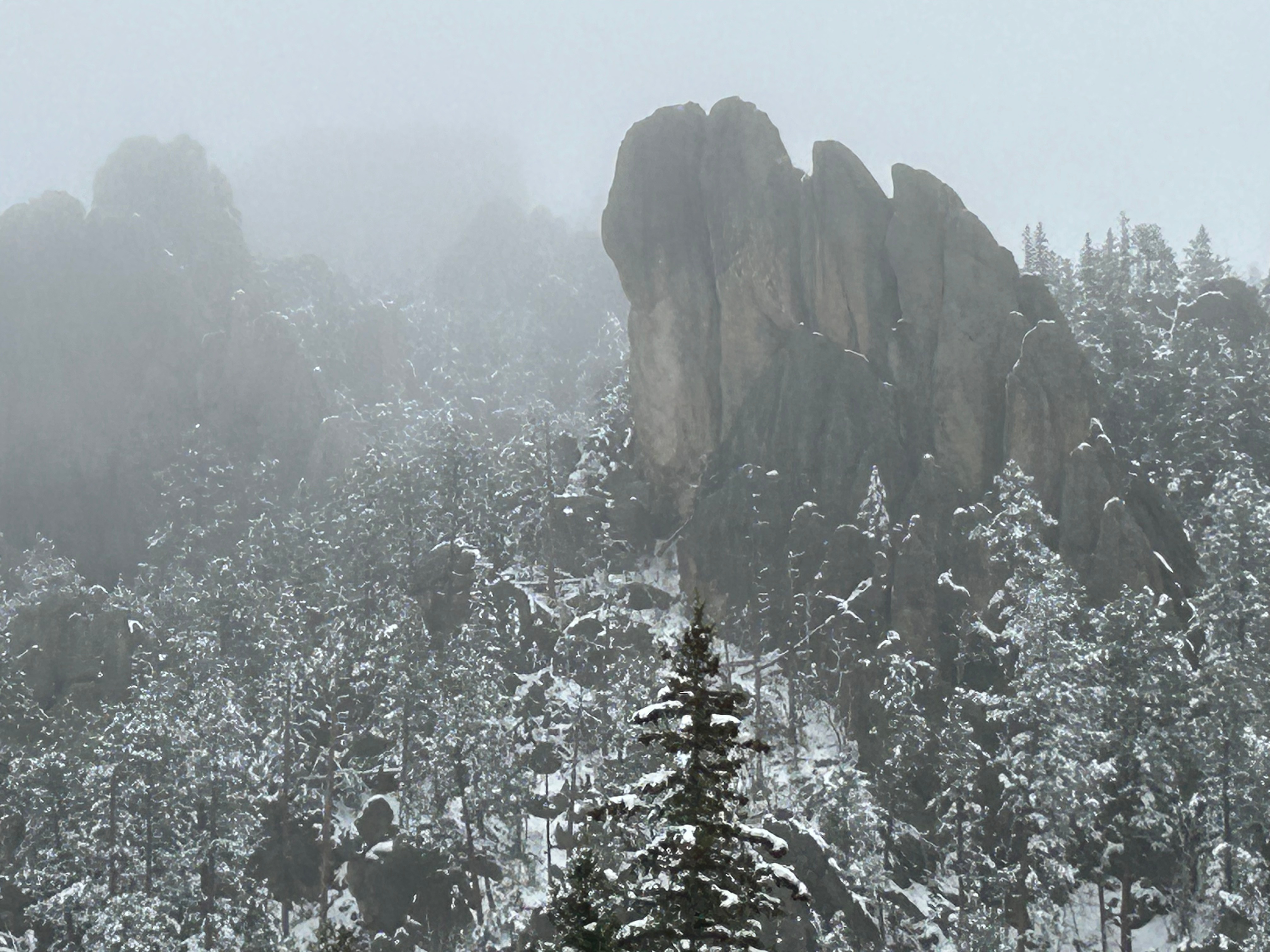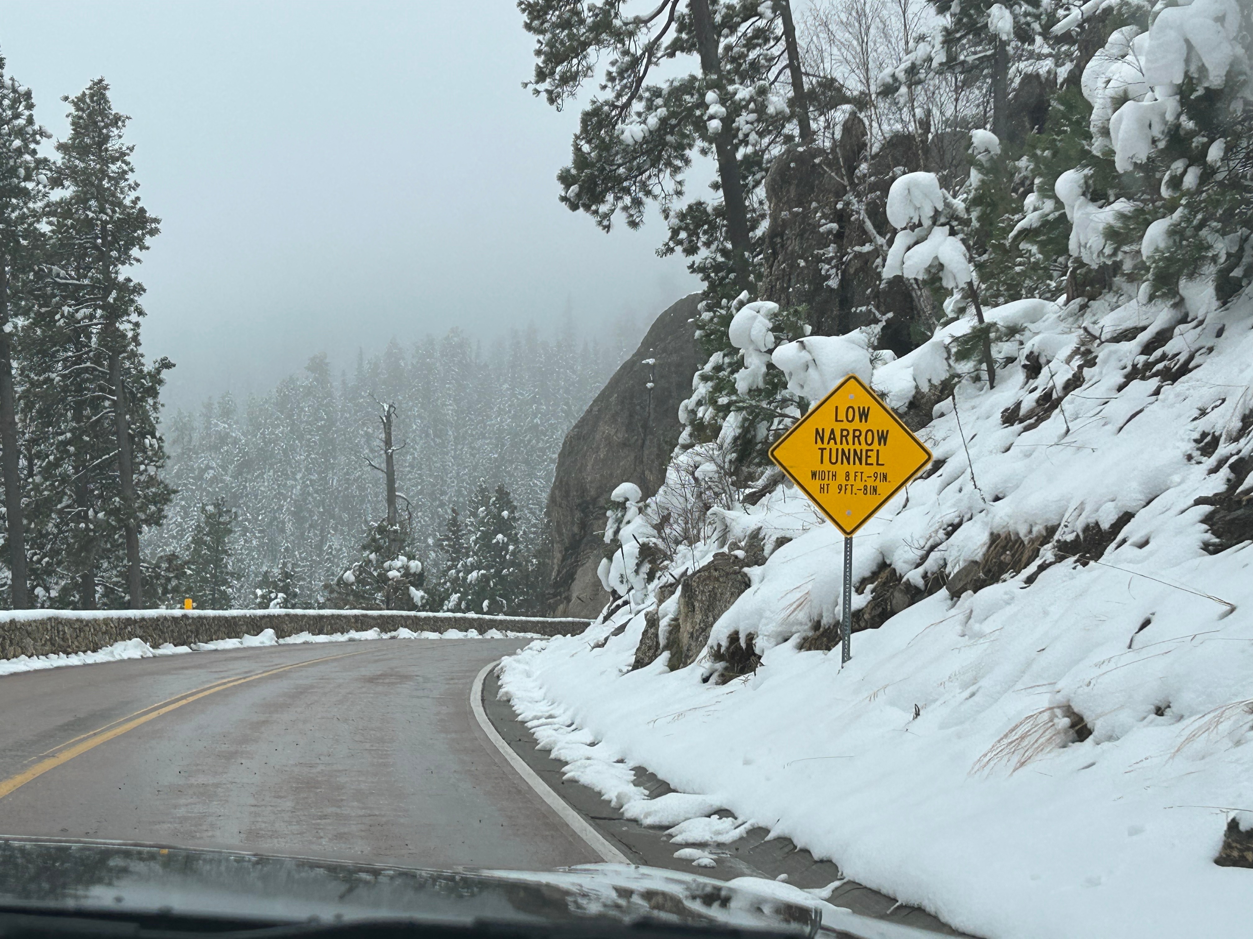 Next up was the second road we wanted to experience…Needles Highway. This 14-mile scenic drive is known for 1000 foot granite spires, tight hairpin turns, and an even narrower tunnel than on the Iron Mountain Road. We started on this road despite the heavy snow around us because the roads looked similar to the prior roads (wet but not slick). We went past a beautiful wintry lake, through the Needles Eye tunnel (9’8″ tall by 8’9″ wide), and drove past jaw-dropping rock formations. As we went up, the temps dropped and it started lightly snowing. Thom was pondering turning back when we passed a sign that said “No Winter Maintenance–Travel at Your own Risk”. That pretty much settled it, and by the time we could find a pull-off (to turn around in), the roads were noticeably slick. Seemed like it was time to go check into the hotel and watch the snow fall from a safe, warm spot.