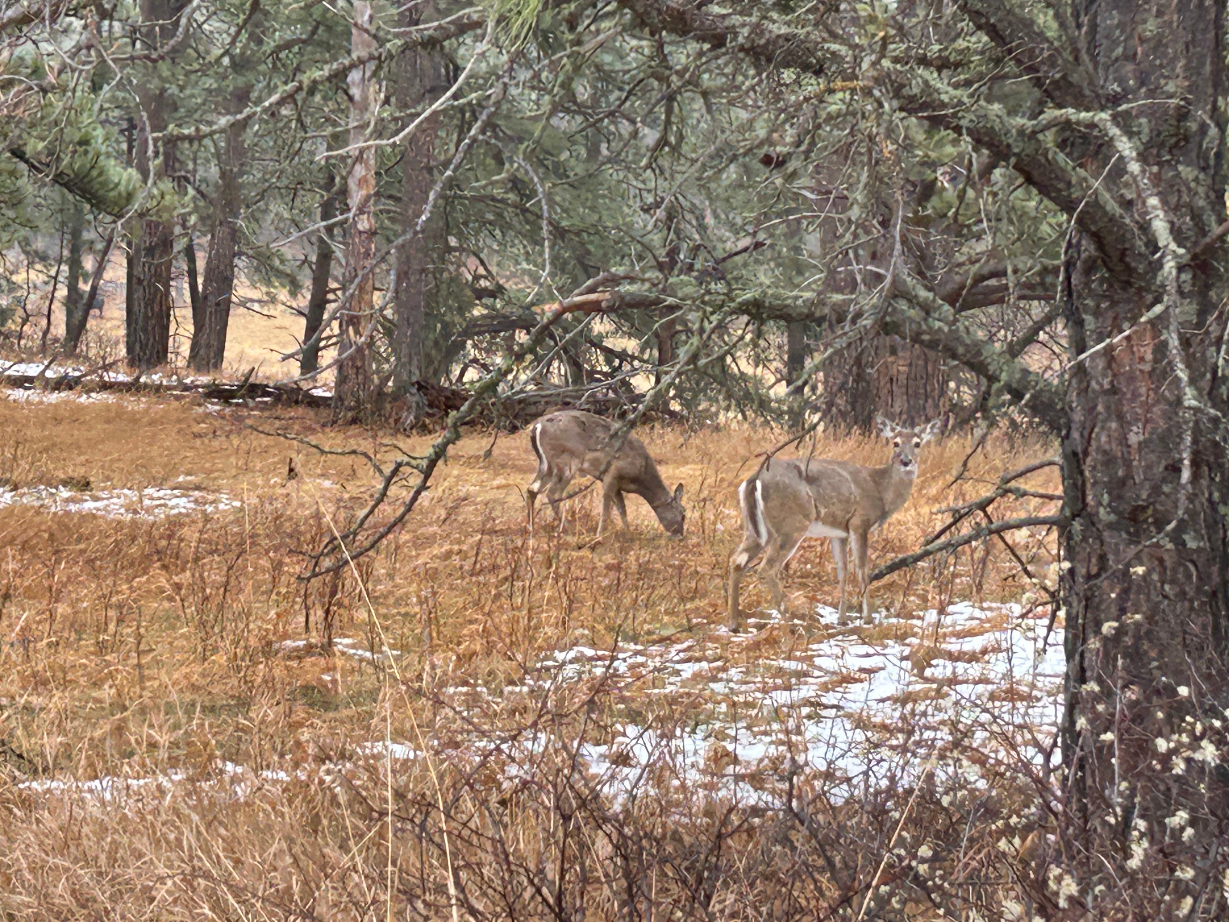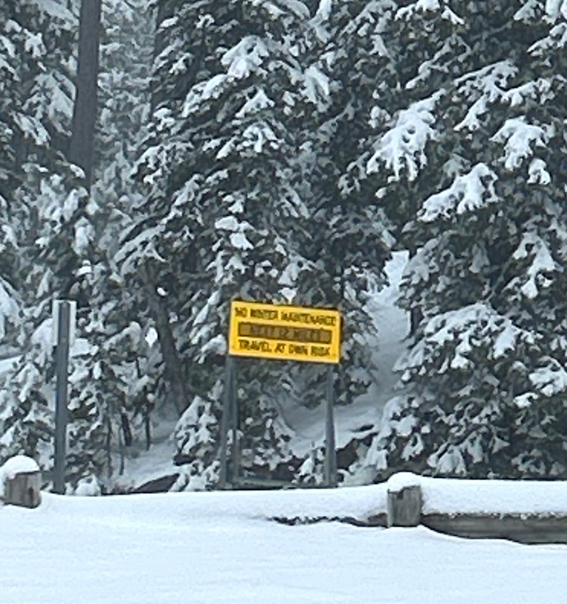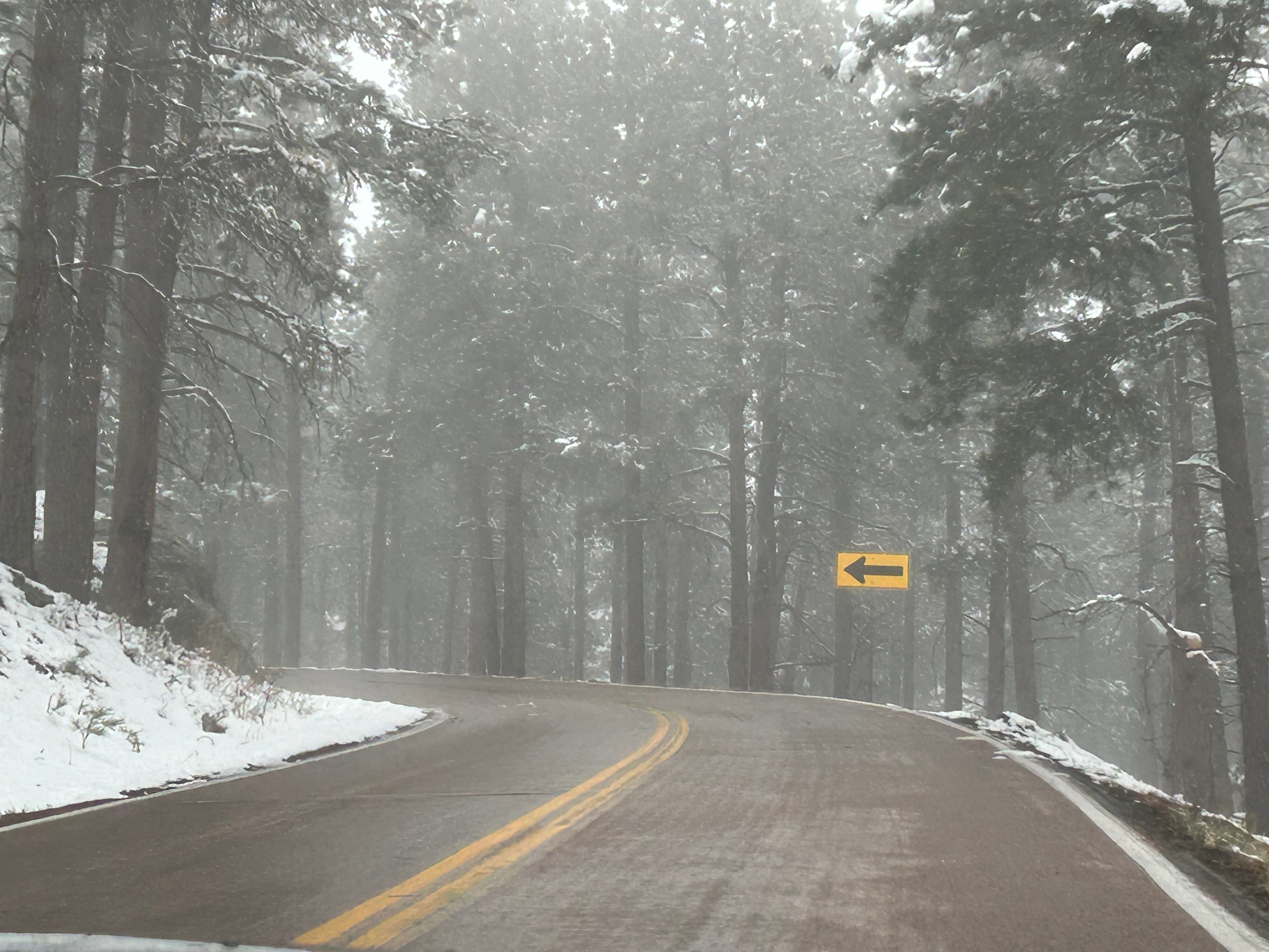Next up was the second road we wanted to experience…Needles Highway. This 14-mile scenic drive is known for 1000 foot granite spires, tight hairpin turns, and an even narrower tunnel than on the Iron Mountain Road. We started on this road despite the heavy snow around us because the roads looked similar to the prior roads (wet but not slick). We went past a beautiful wintry lake, through the Needles Eye tunnel (9’8″ tall by 8’9″ wide), and drove past jaw-dropping rock formations. As we went up, the temps dropped and it started lightly snowing. Thom was pondering turning back when we passed a sign that said “No Winter Maintenance–Travel at Your own Risk”. That pretty much settled it, and by the time we could find a pull-off (to turn around in), the roads were noticeably slick. Seemed like it was time to go check into the hotel and watch the snow fall from a safe, warm spot.