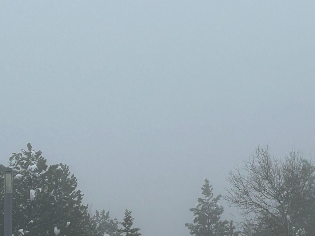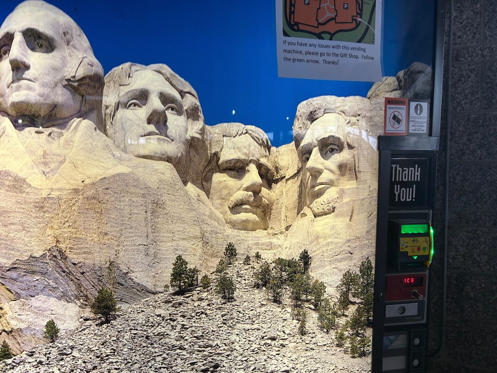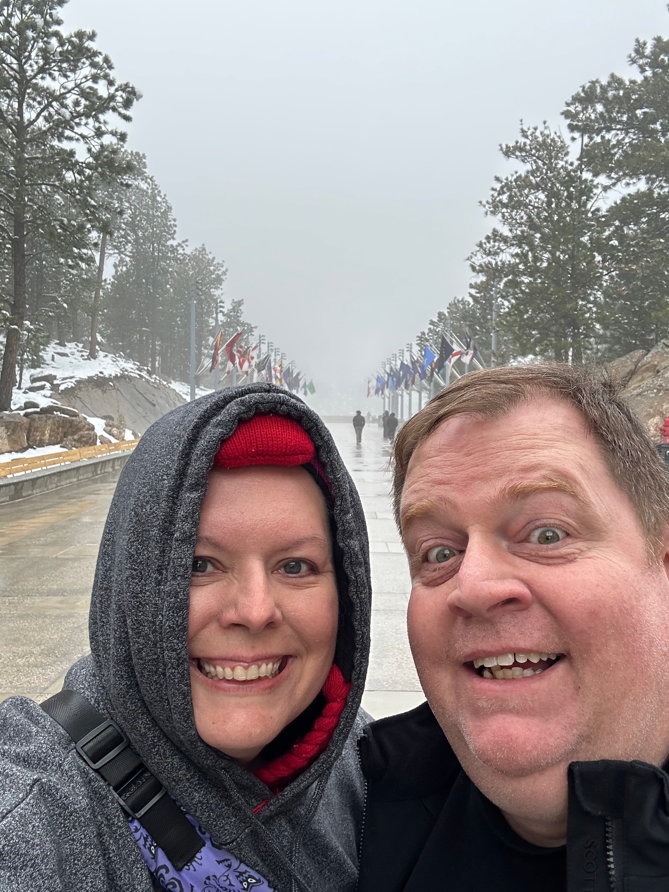 As you may have noticed from the pictures, there was no iconic Mount Rushmore view through a tunnel. There were just too many clouds. No problem, we were going to see Mount Rushmore up close after driving this road. Well, fun fact, you apparently don’t get all that close to Mount Rushmore, as we found out after paying $10 (since it’s not included in the National Park Pass, for some reason). We navigated the massive parking system, walked up through snow and slush, and were sorely disappointed at the wall of dense clouds. Ah well, we got a picture of the monument off the drink machines and I got to make a snowball, so all was not lost.