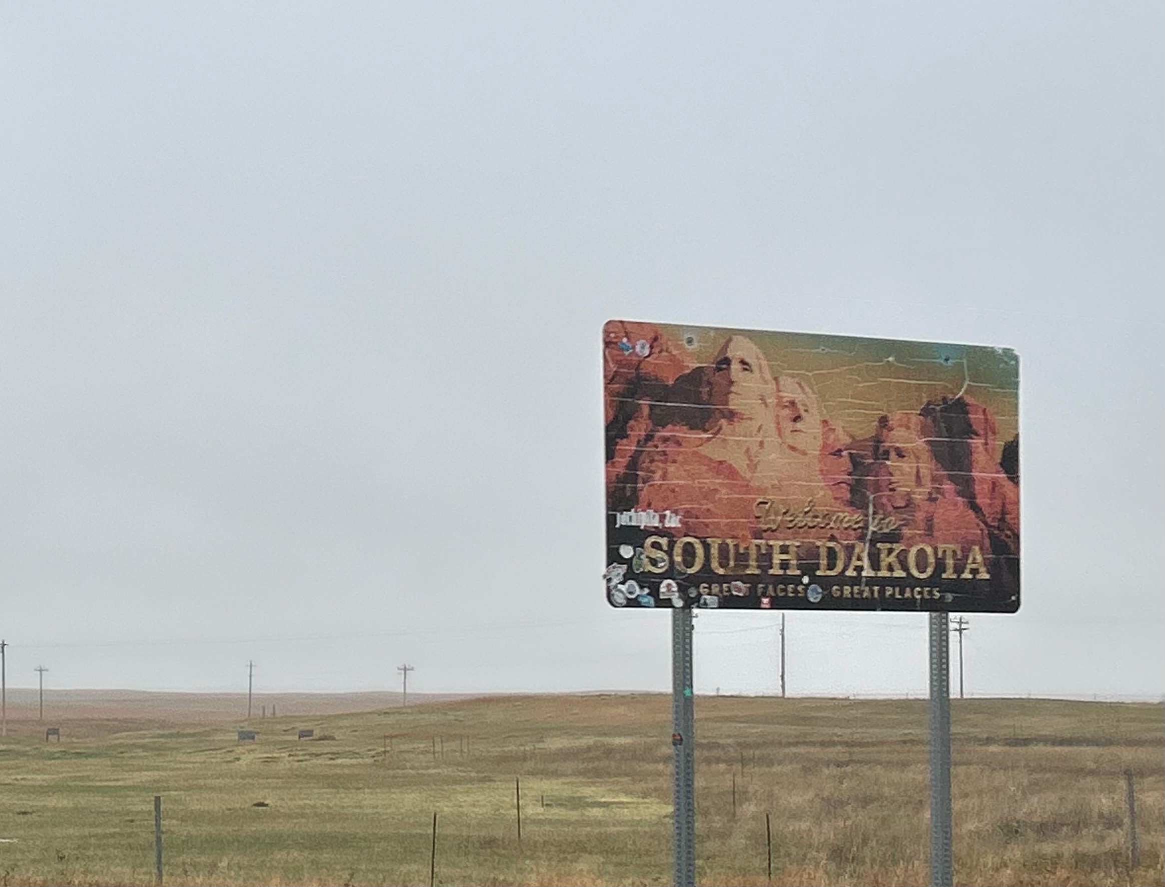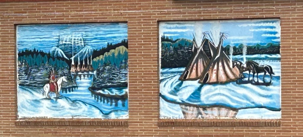 As we moved on from Nebraska to South Dakota, the landscape started including more shrubs and trees that were dark, almost dead looking. Turns out these were Black Hills Spruces and Ponderosa Pines. We drove through small towns and tribal lands, enjoying art on some of the local buildings.
